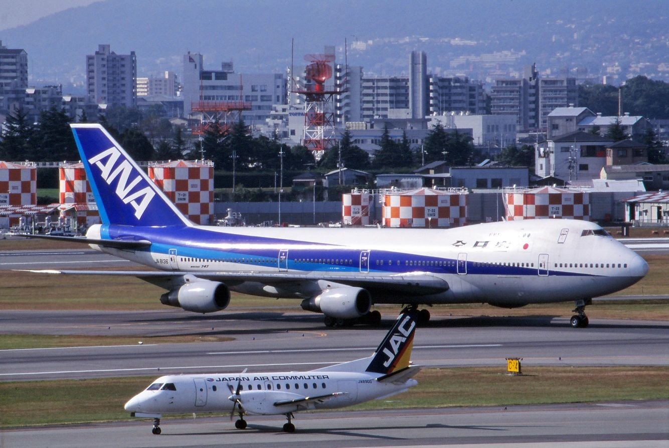 「ポジ」アナログからデジタルに読み替えをいたしました、手前の(JAC)機は可愛くてよりジャンボ(747)が引き立つ伊丹です。この頃は(スカイパーク)はまだ開設されておらず送迎デッキも突き出しまで入れての撮影です。