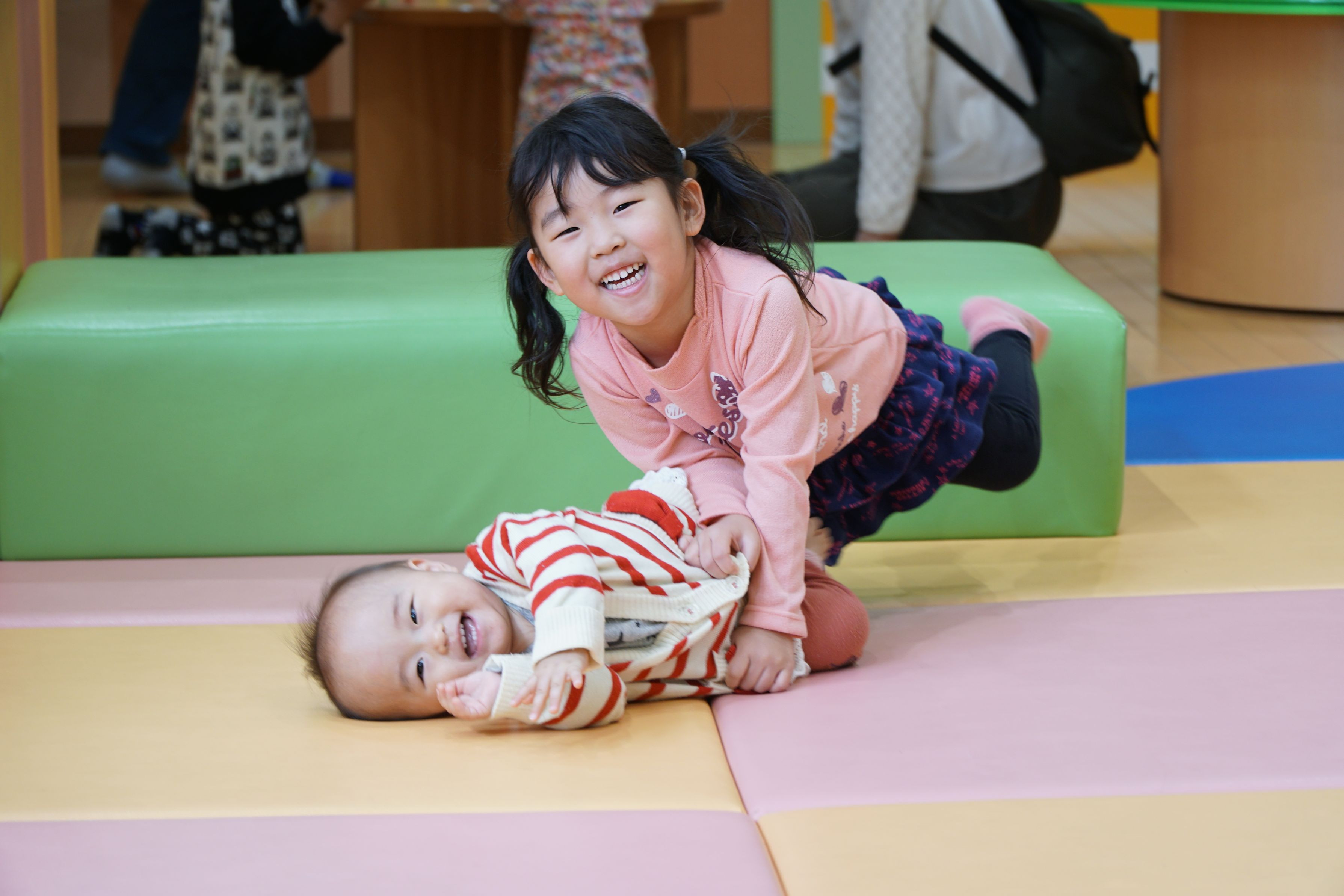 キッズスペースで遊ぶわが子を撮りました。 下の子が押し倒されても笑顔でいたのに驚き。