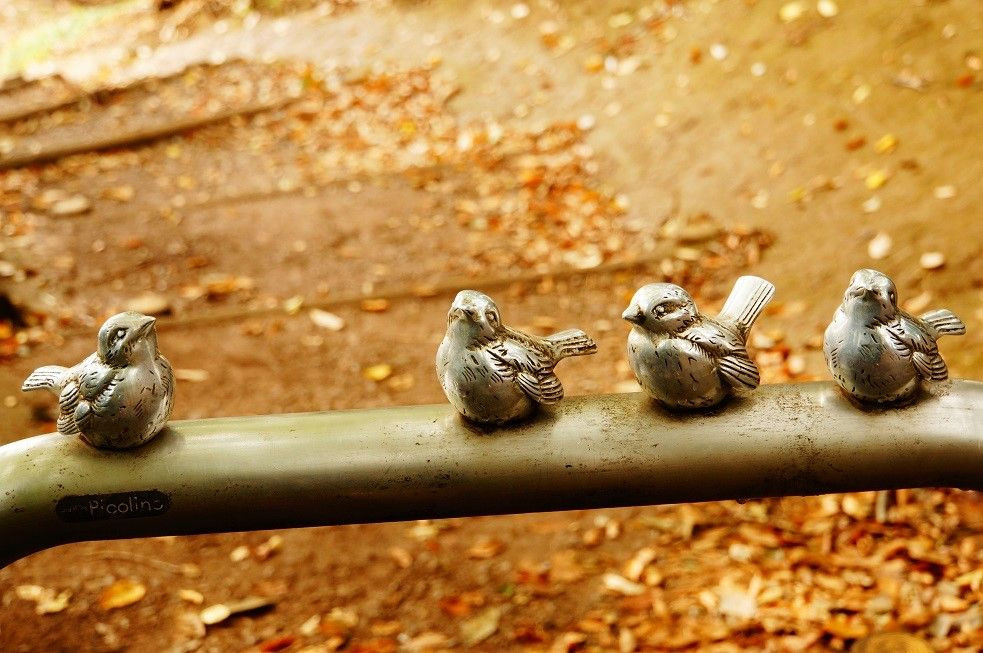 散歩中に立ち寄った公園の柵にすずめのオブジェが、、、、。