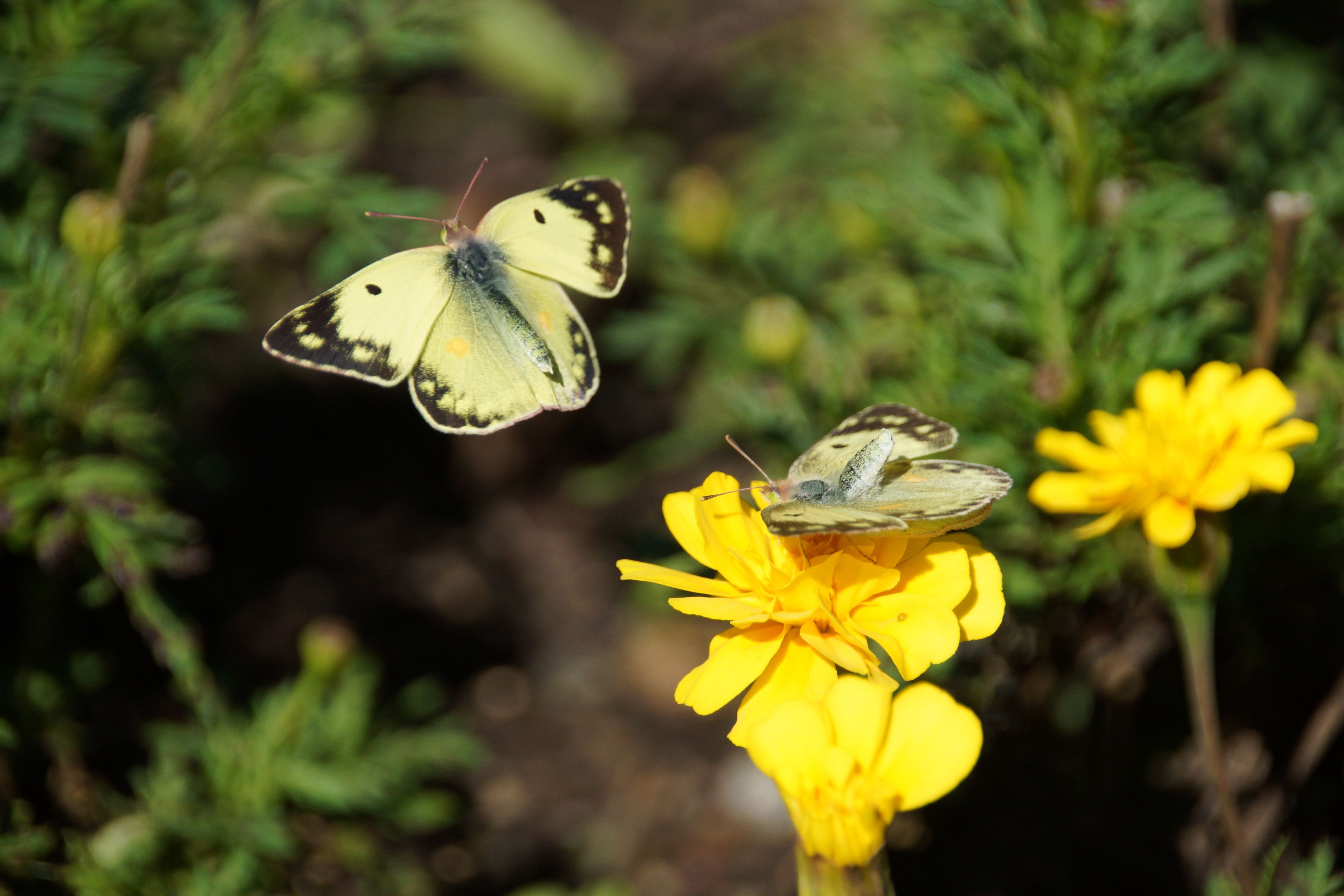 一羽の蝶々が花に止まっている蝶々の周りを飛んだり横に止まったりを繰り返していましたが 昆虫は詳しくありませんが、素人の自分でも求愛行動にみえるのですが… どうなんでしょう?