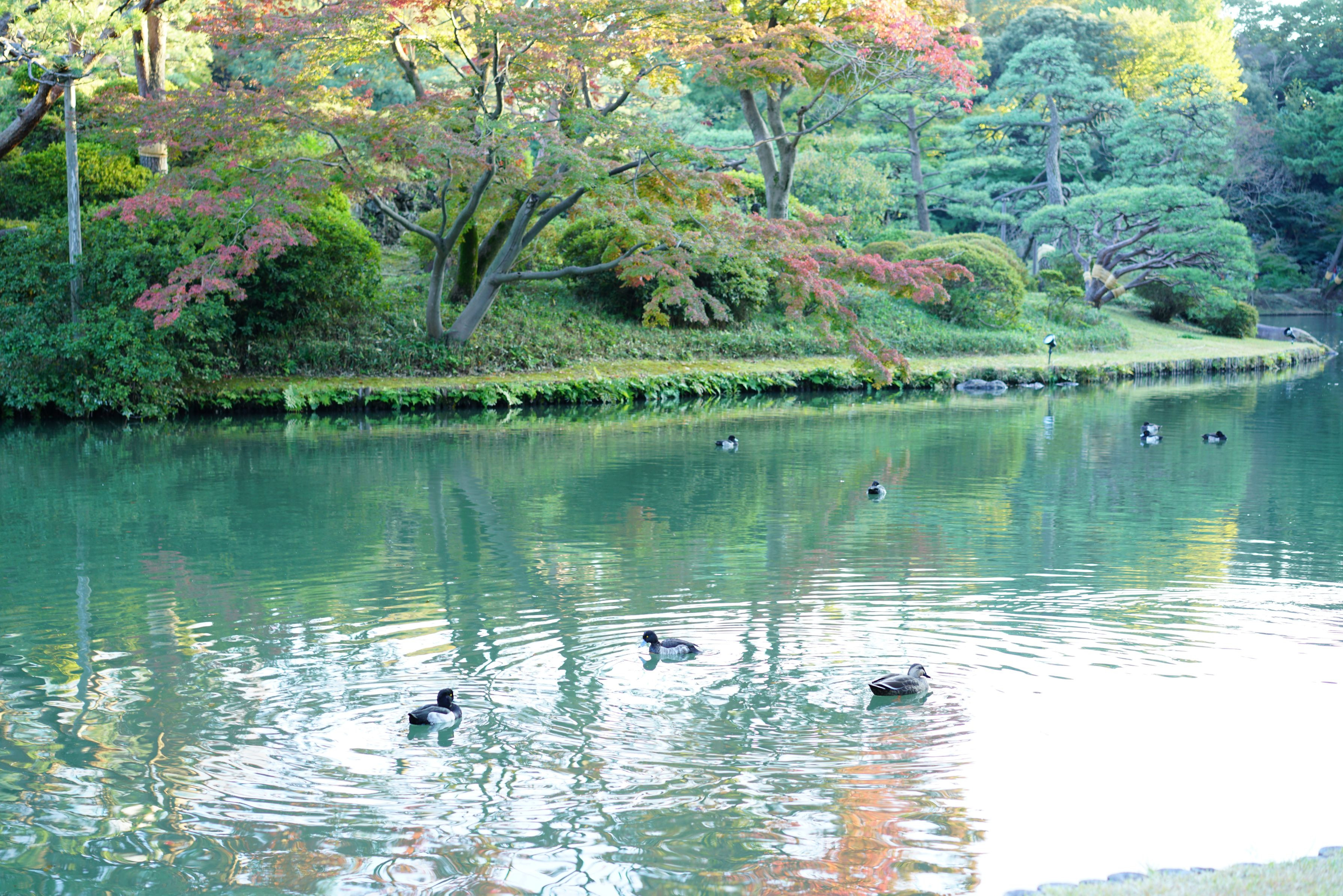 夕暮れ近くの六義園。三羽仲良く楽しそうです。