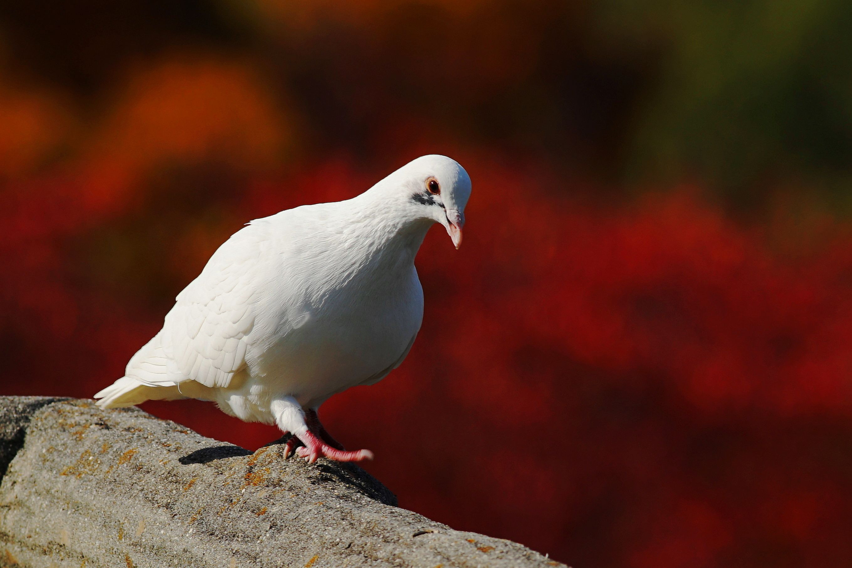 真っ赤に色づく紅葉を背景に、白いハトを撮ってみました。