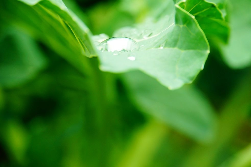 雨上がりの散歩道、キャベツ畑の葉っぱは水滴がいっぱいでした