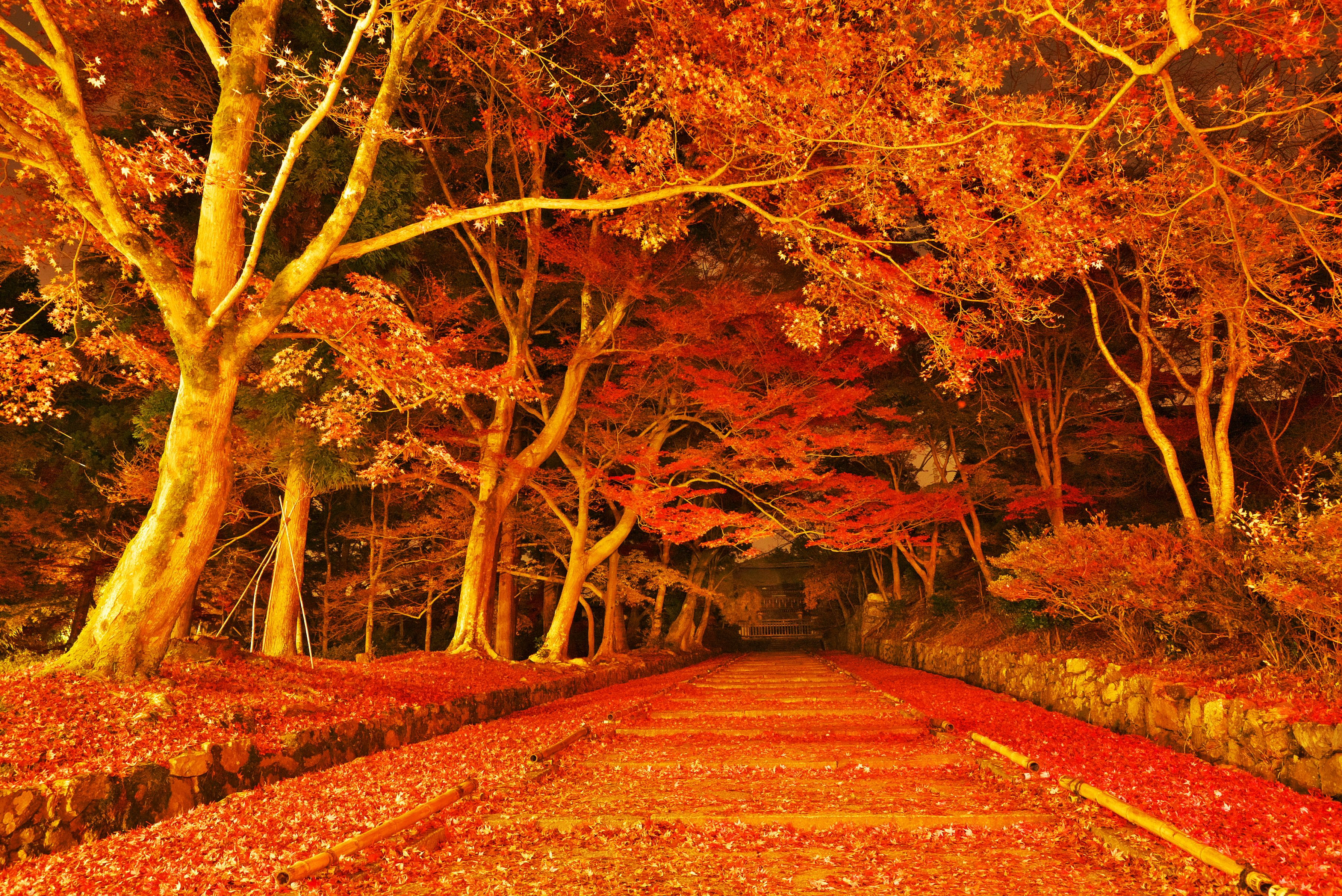 京都、毘沙門堂にて 日が暮れてから、暗闇の中、手前の外灯の灯りのみで撮影しました。