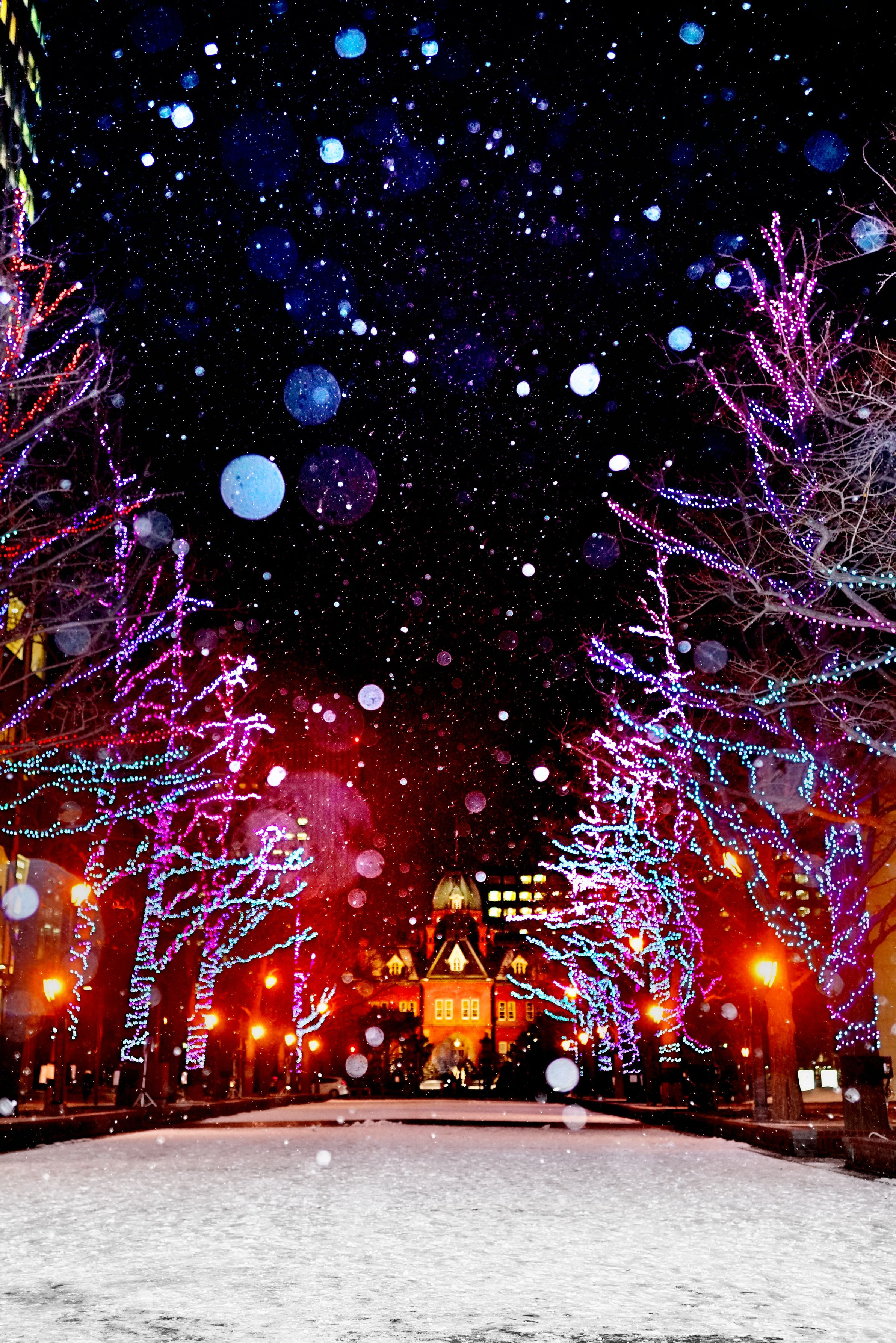 2016/12/2 札幌赤レンガテラスにて α99Ⅱ+Vario-Sonnar T* 24-70mm F2.8 ZA SSM with HVL-F60M l は24mm縦位置でV字型に雪が舞うゾーンを。ただ、広角なのでどうしても雪のボケが小さくなってます。 ll は70mm横位置でボケも赤レンガも大きく。 lllは35mm縦位置でlとllの中間のイメージ。ちょっとトリミングしてます。