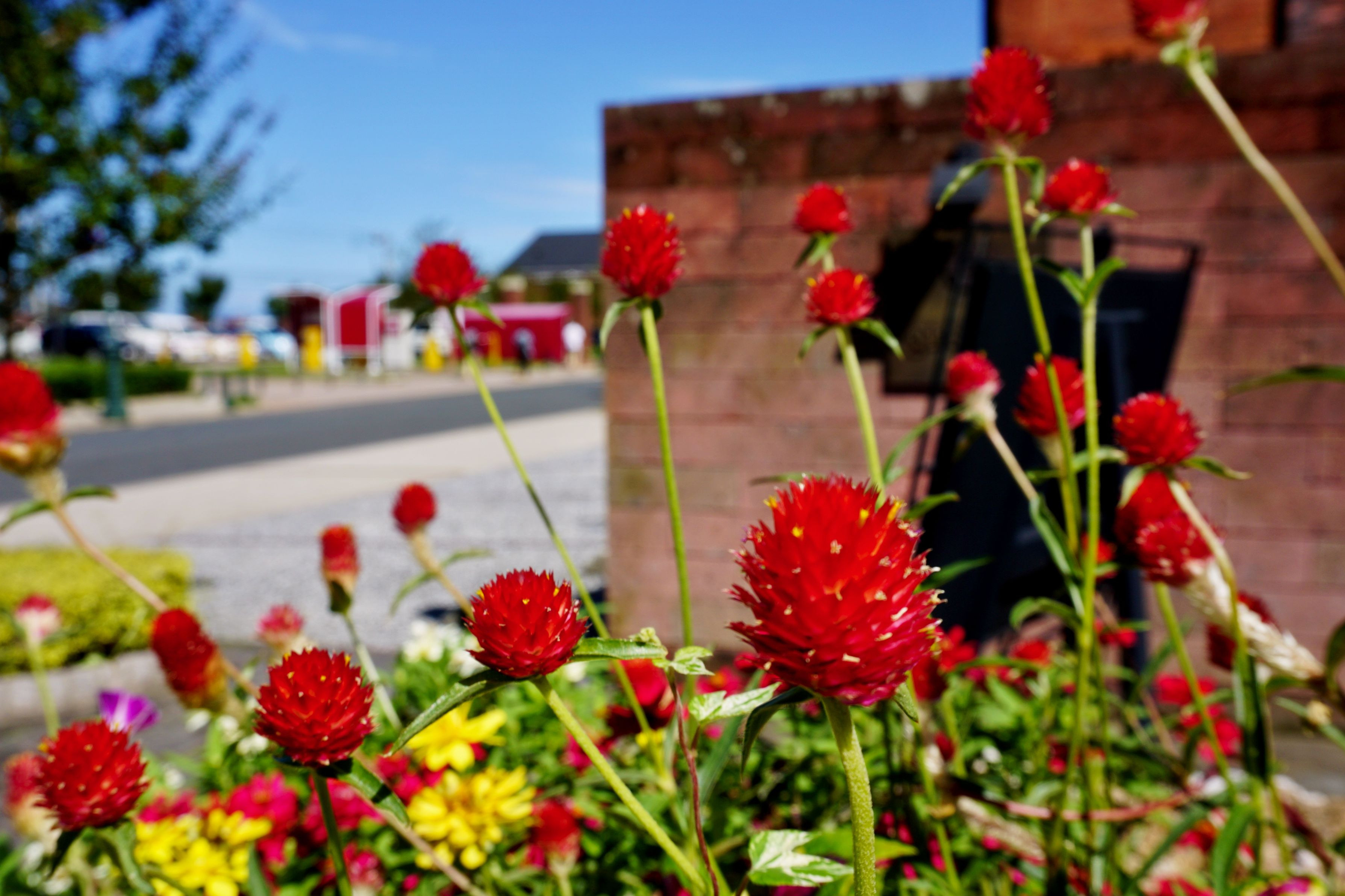 ほんの少しの赤い花のバックに 煉瓦街