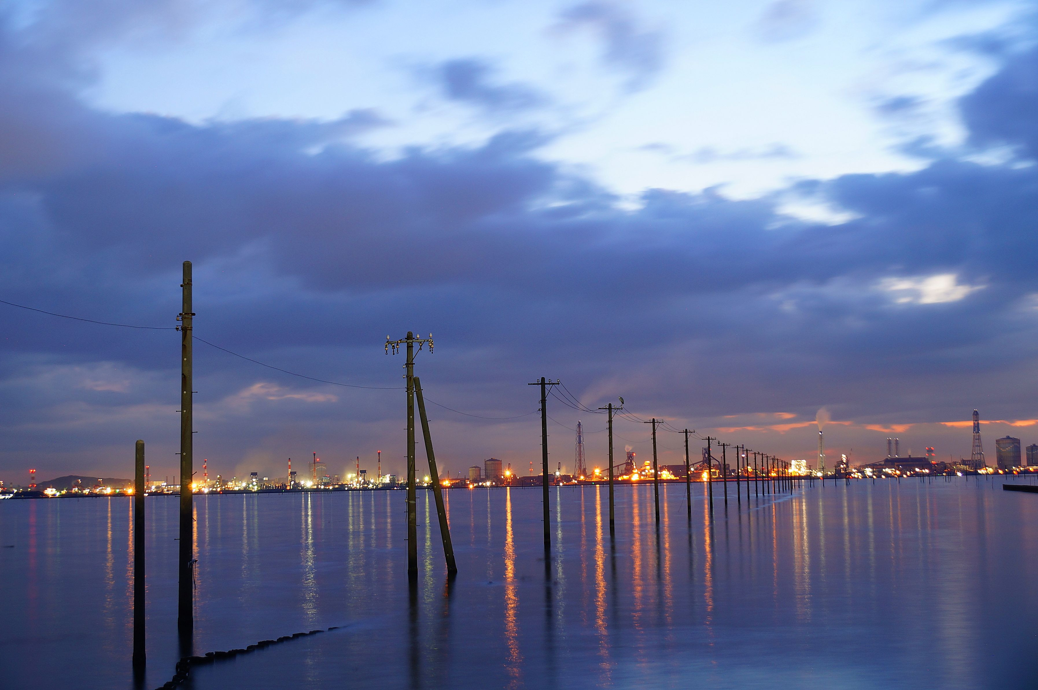 江川海岸の電柱と工場夜景が海に映り込みました。