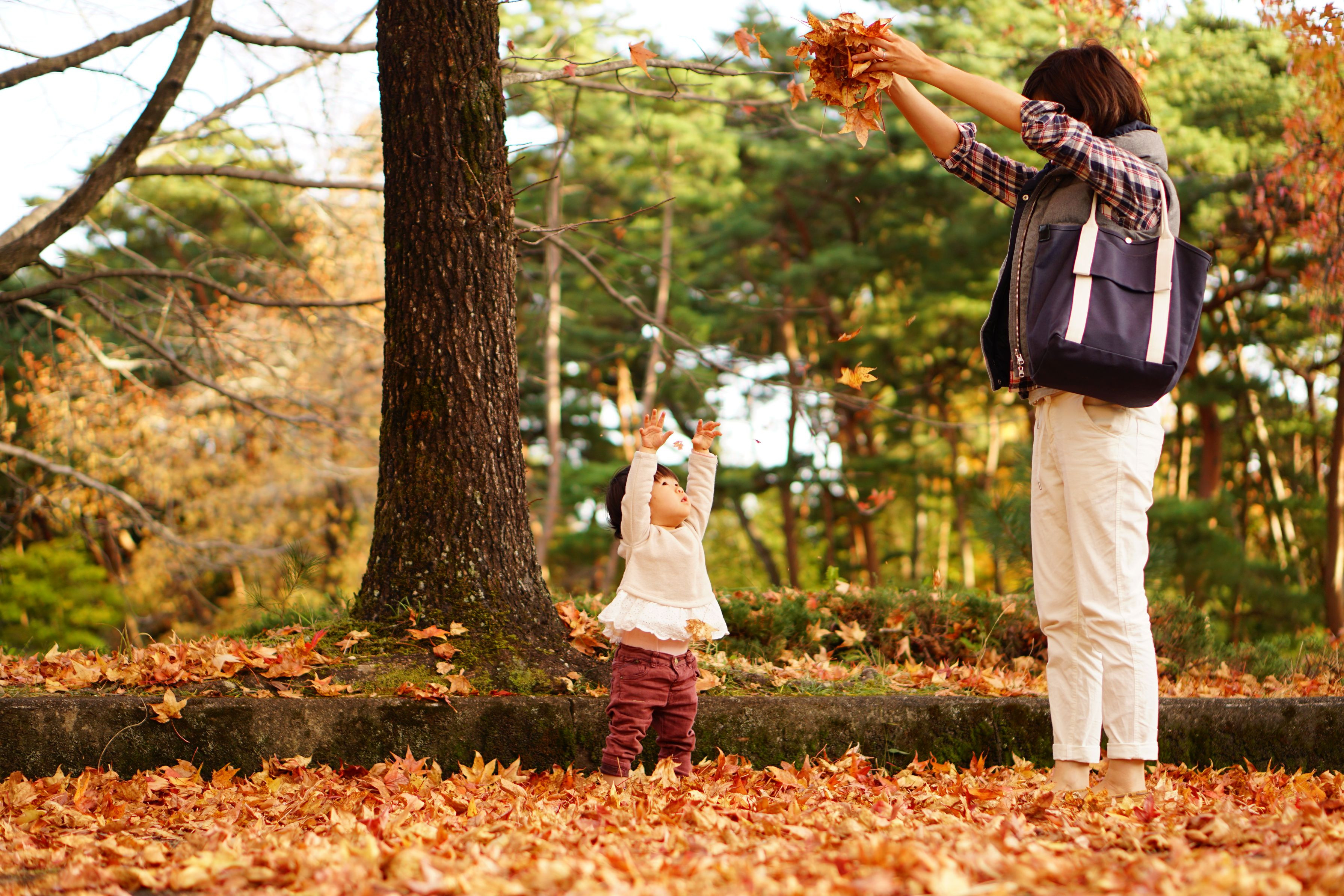 モミジバフウの落ち葉を降らせてみたら思った以上に楽しんでました。