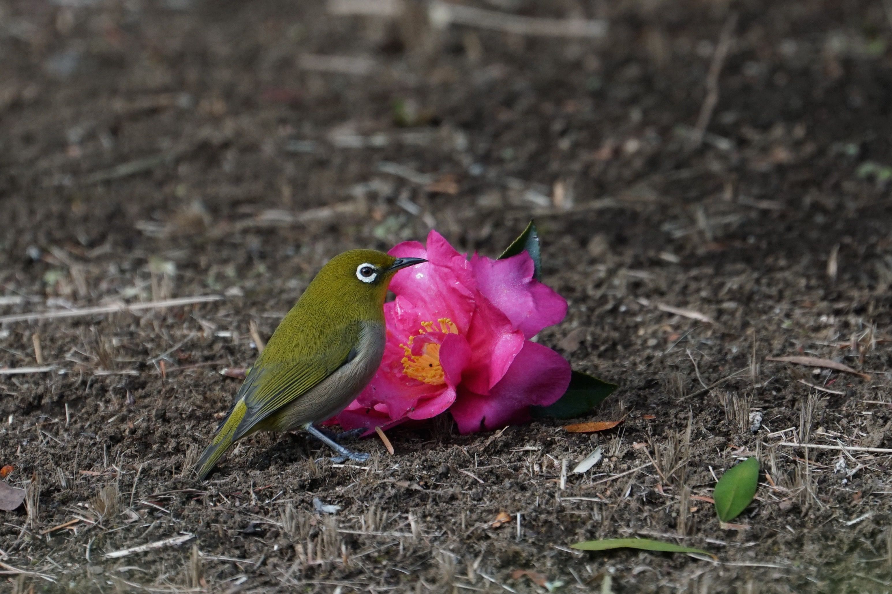 落ちていたツバキの花の前でポーズ