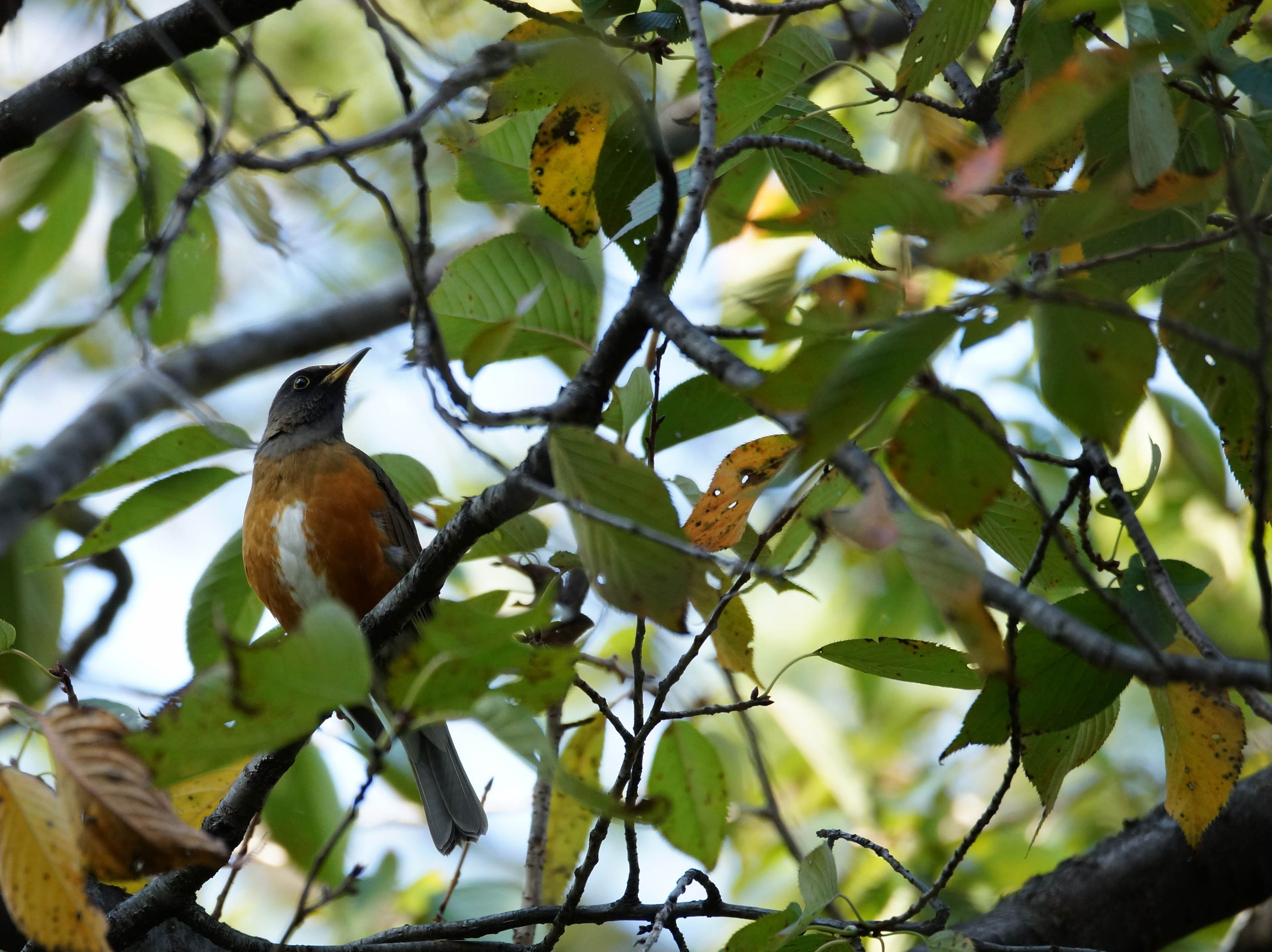 地表にいるイメージが強いアカハラ。 木の実があるうちは地上なのだろうか。