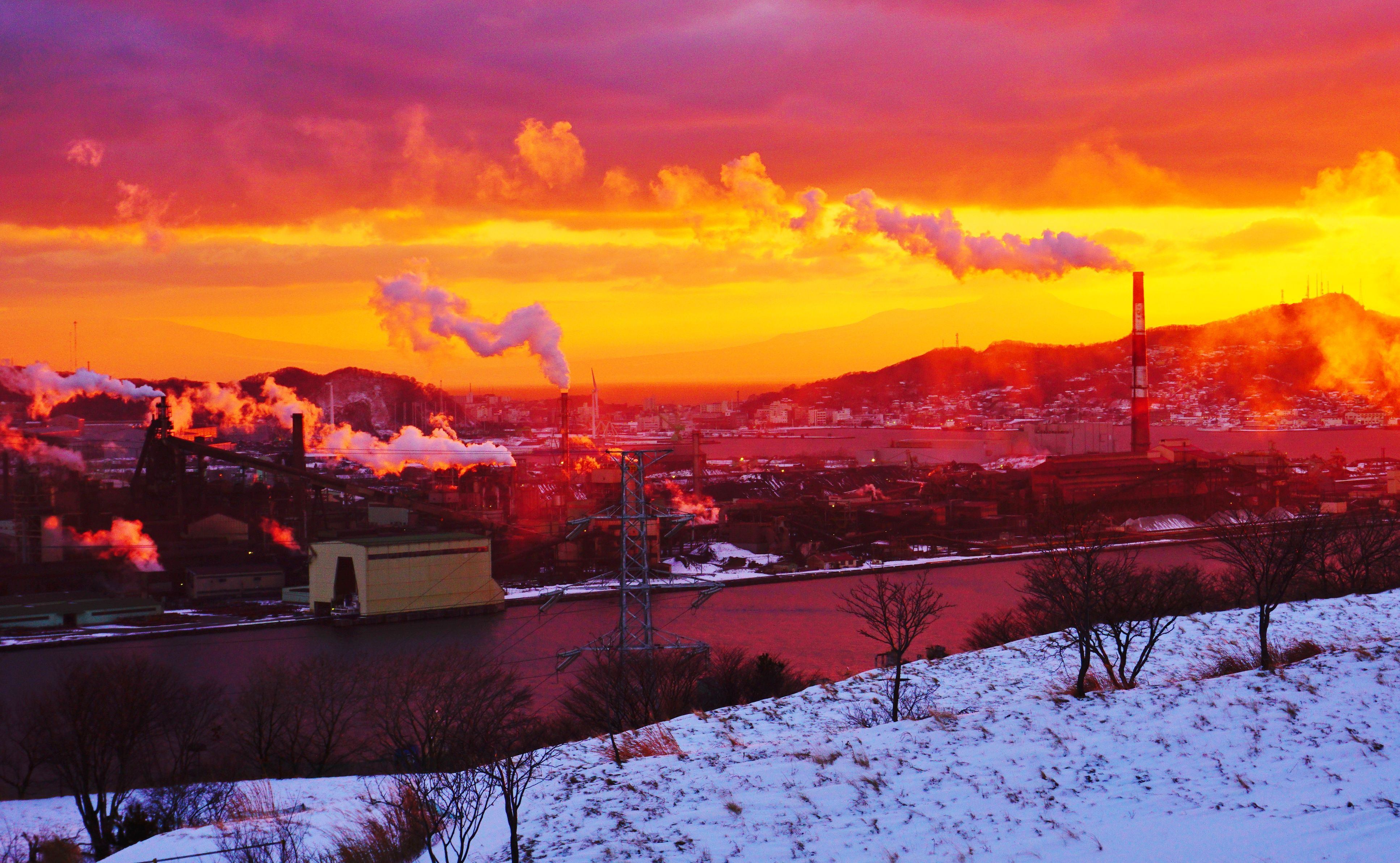 夕暮れの室蘭港。製鉄所の煙は絶えることなく、手前の岸壁には船が接岸できる 大きな建物がある。天候に左右されず製品を積みだせる。