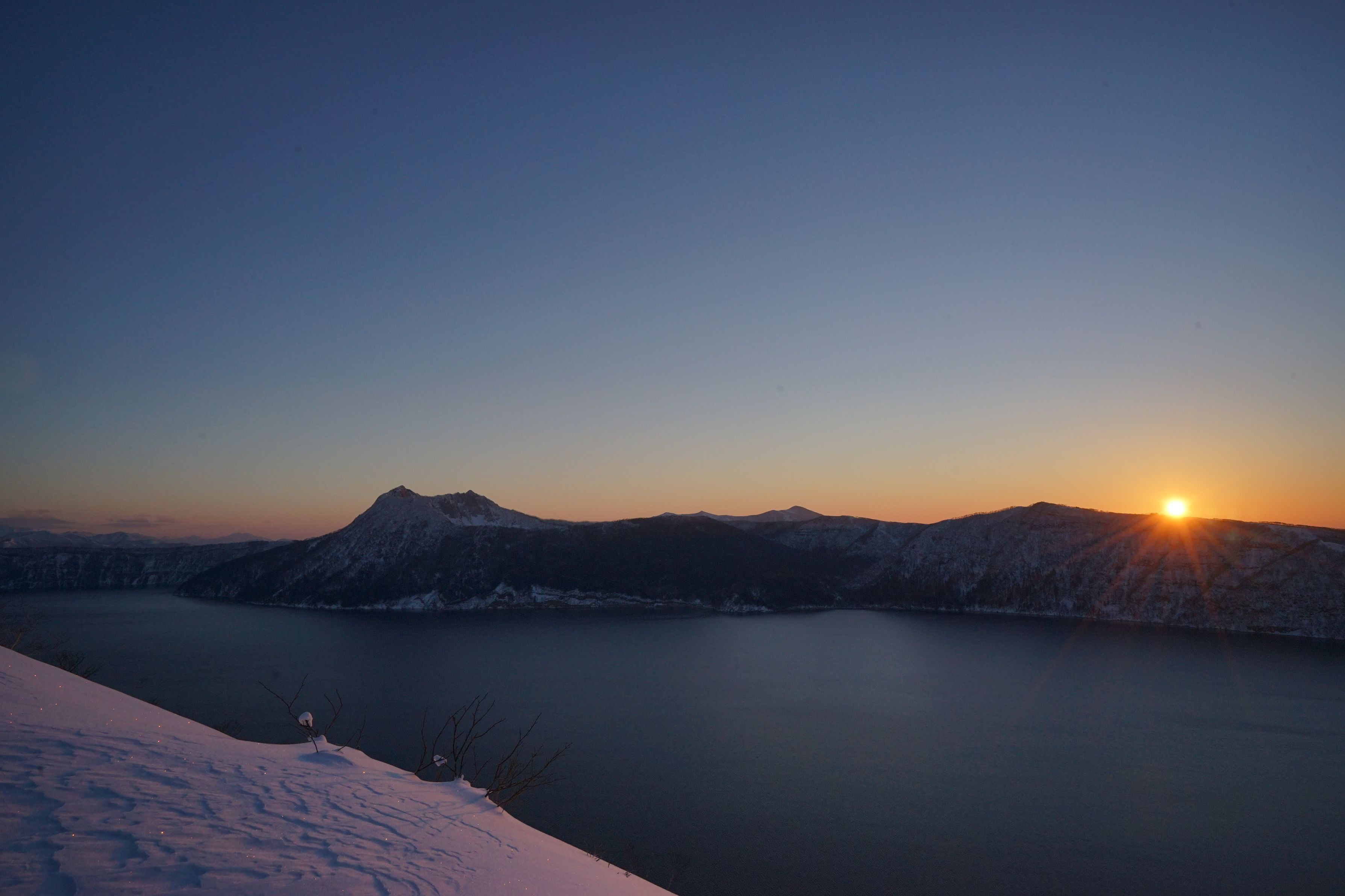 昨年はあまり精進できなかったので、気合を入れての初日の出。 -22℃の世界にもかかわらず、湖面は凍っていなかったのが幸いでした。