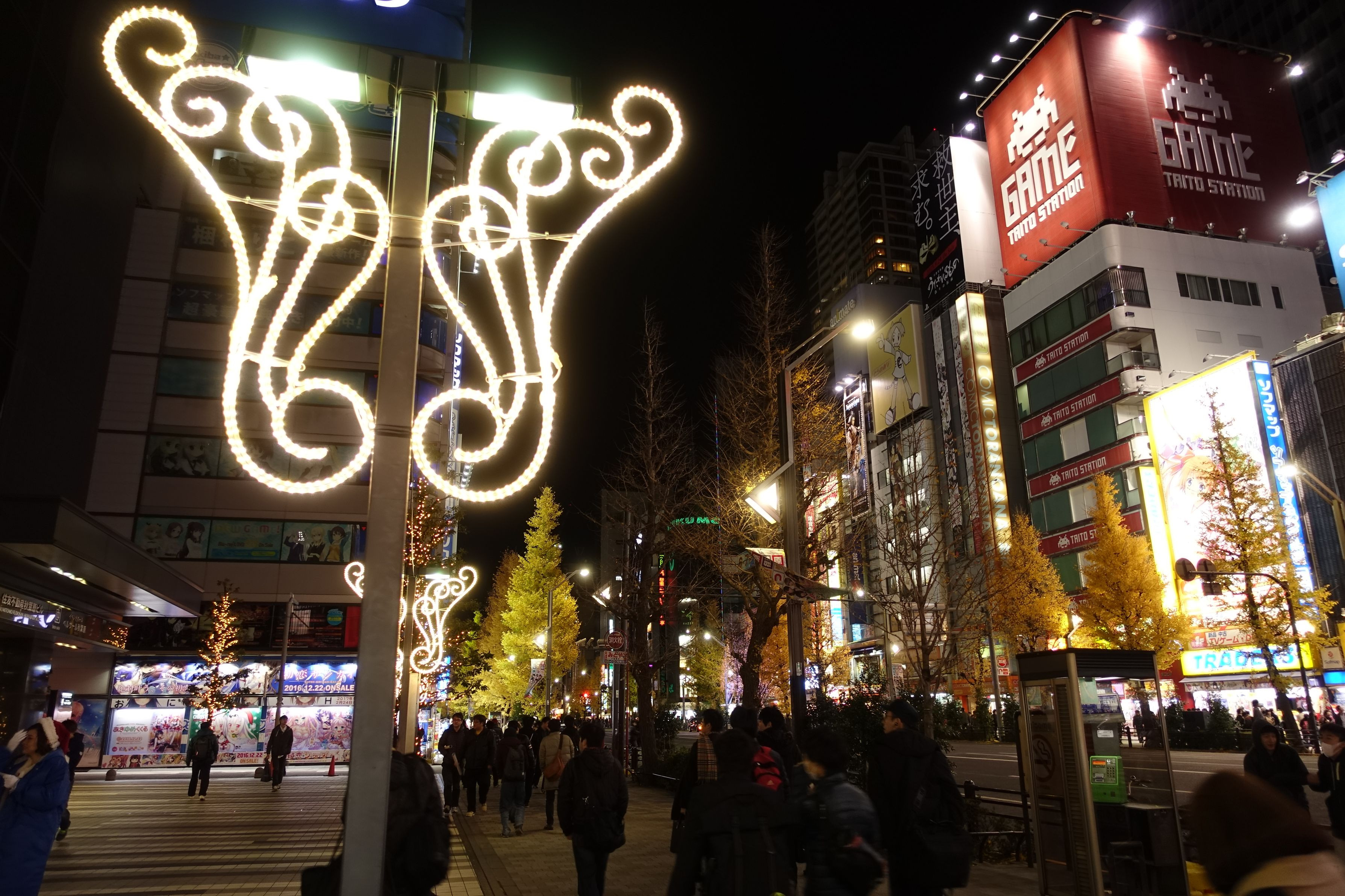 東京・秋葉原の中央通りでクリスマス前の賑やかな様子を、イルミネーションと一緒に写してみました。 (この電飾はクリスマス限定なのか、先日行った時にはもうなくなっていました)