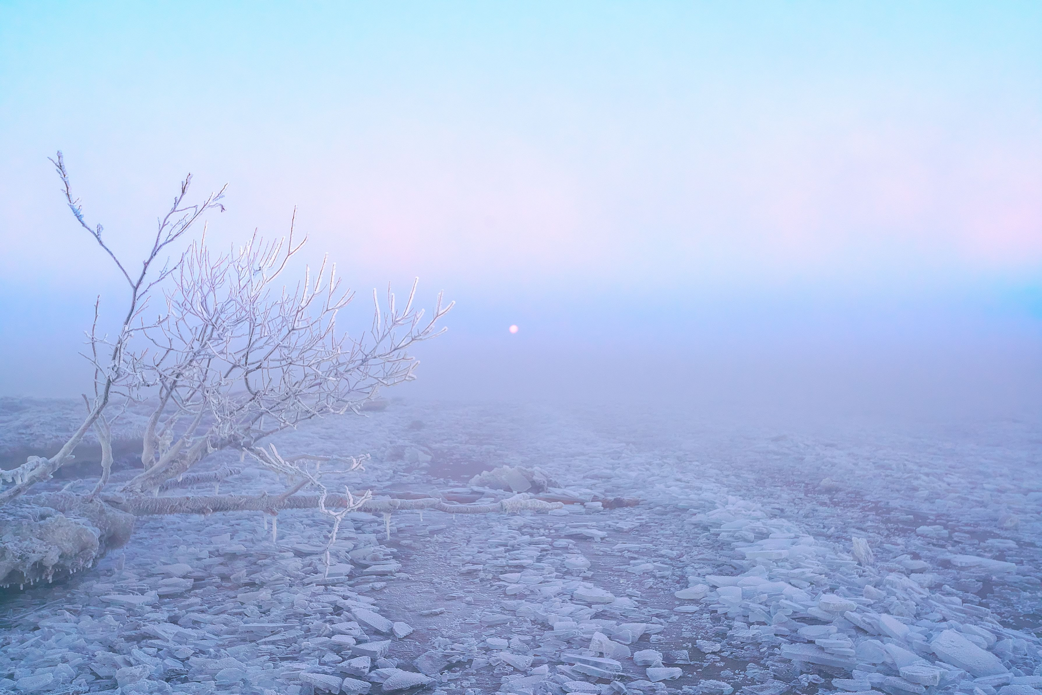 2017/1/13 十勝川河口 α99Ⅱ+Vario-Sonnar T* 16-35mm F2.8 ZA SSM 気温は氷点下22℃ほど・・・・ ジュエリーアイスも板氷も凍り付いてしまい、気嵐がもうもうとしており 寒すぎていまひとつ・・・ 気嵐の中、霞みながら日高山脈に沈む満月。