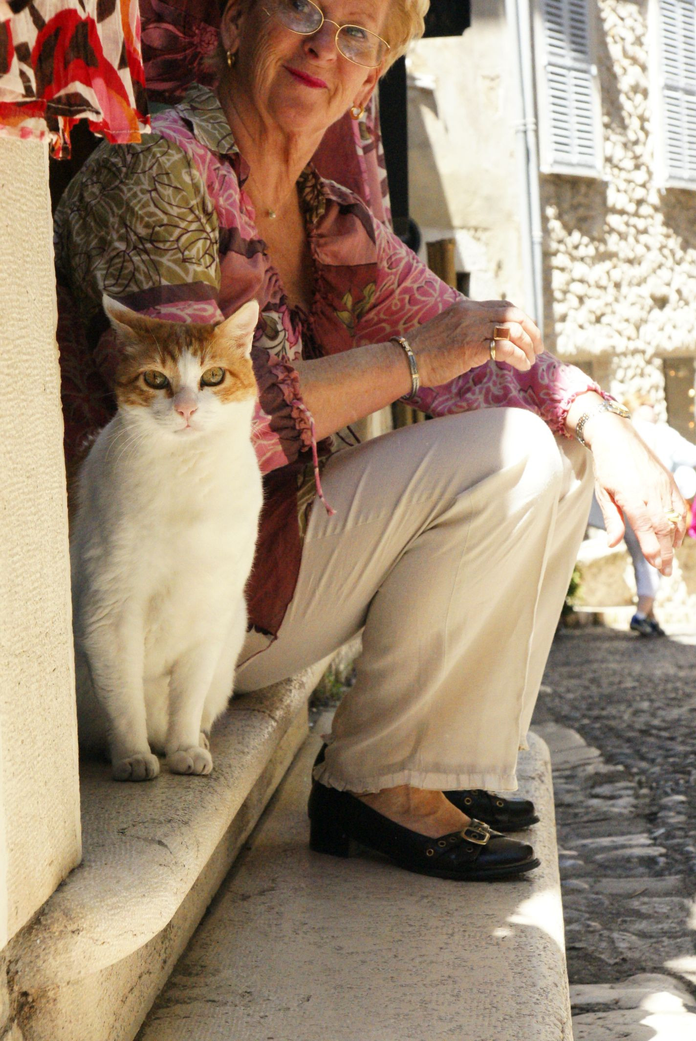 南フランスのヴァンス村にて。 お店の前にいた猫と急にフレームインしてきたマダム。
