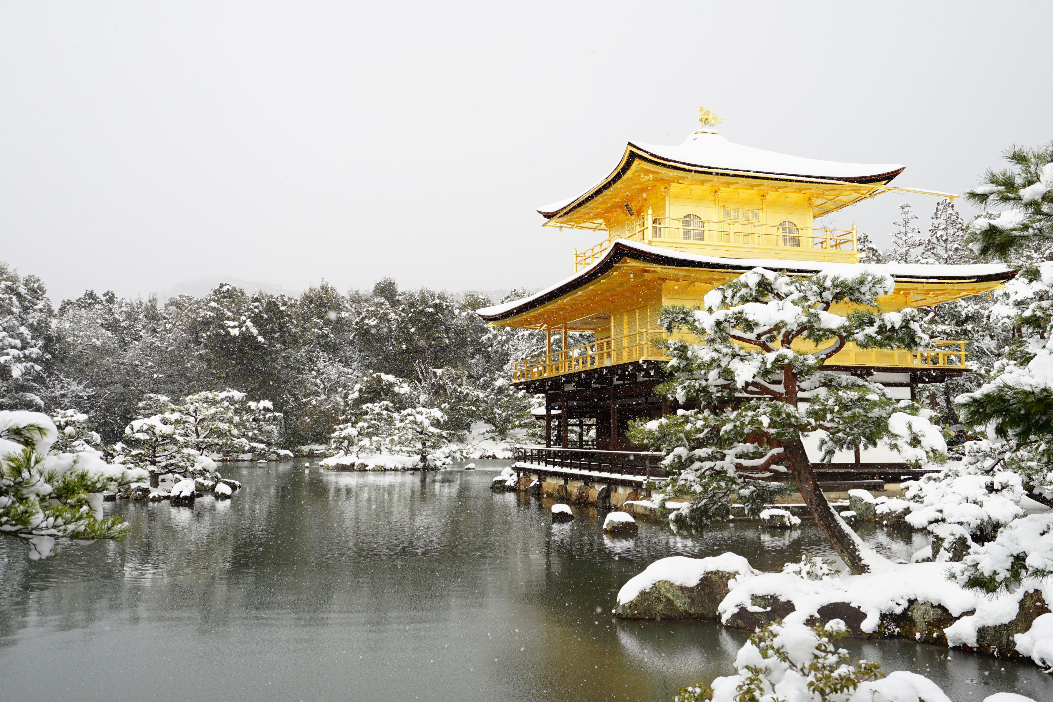 昨日からの雪で、珍しく日曜日に雪が積もったので、一度は行って見たかった雪の金閣寺に朝一で出かけて来ました。9:10ごろに着いたのですが、すでに門前は長蛇の列!金閣が見える池の前の撮影スポットはすごい人だかりで、順番待ちによる場所取りが大変で、しかも終わって出るのも一苦労(;^ω^)ちょうど、晴れ間も出て、太陽の光を反射したところも見れてとても良かったです!