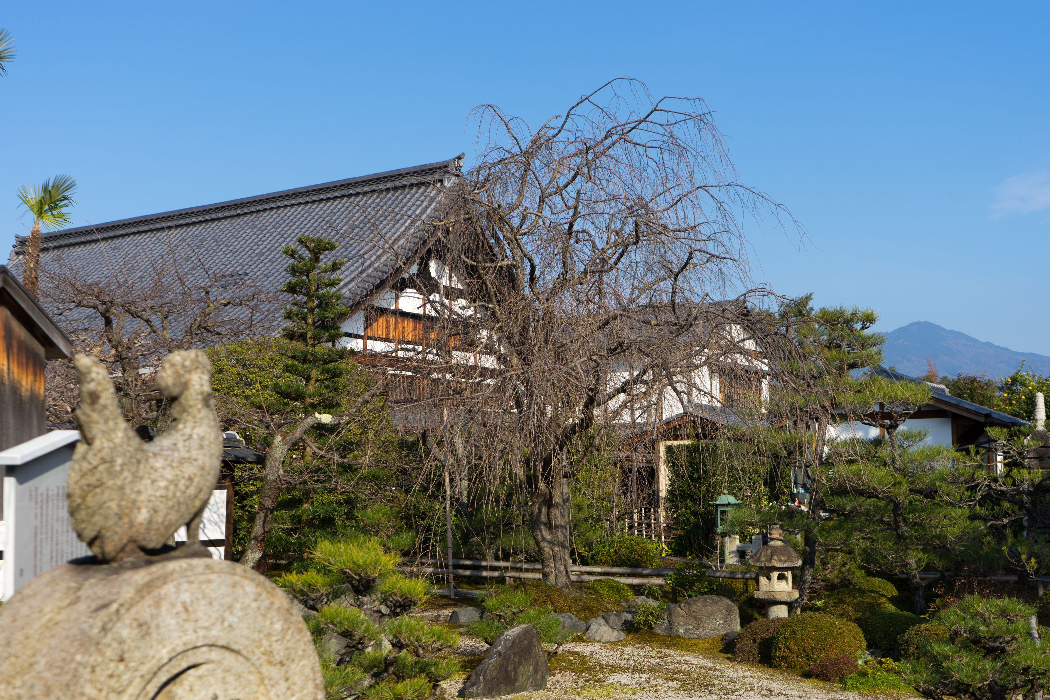今年の干支(酉)に因んだ寺社に行こうと思い、天寧寺へ行ってきました。 そのお寺の諫鼓鶏(かんこどり)の石灯籠です。 門のほうから見ると、奥に映る比叡山を眺めているようです。