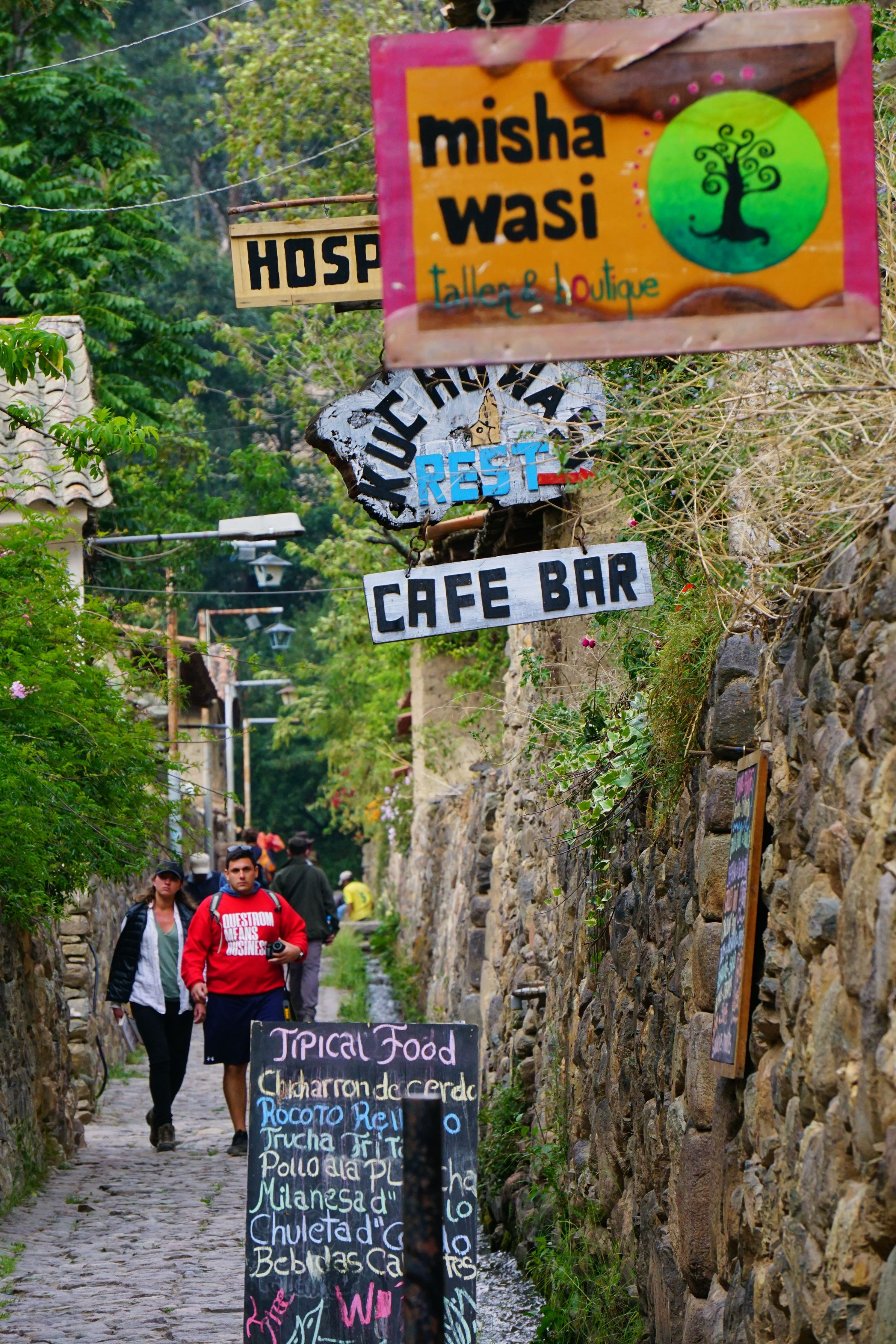 ペルー、オリャイタイタンポの村の路地です。この村も近年西洋人に人気らしく、観光客めあての店や宿が増えてます。看板やメニューがラテン系の色使いで落ち着いた村の中にもポップな雰囲気を漂わせています。