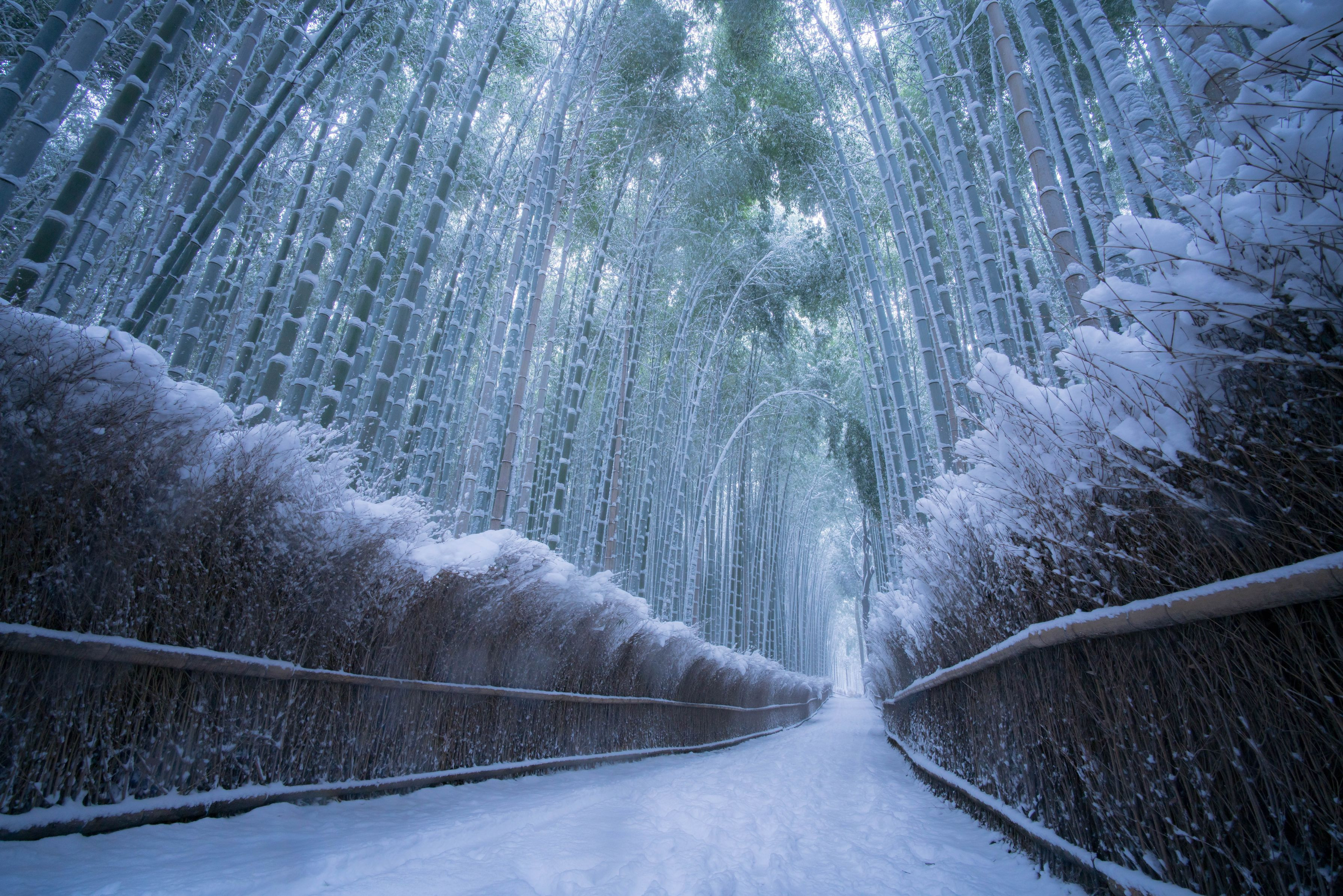 どうしても嵐山の竹林に雪が積もった状態で撮りたく、2日連続午前3時起きで撮影してきました。時折吹雪、時折竹の上から雪が落下し人もカメラも雪まみれになりながら撮影した1枚です。