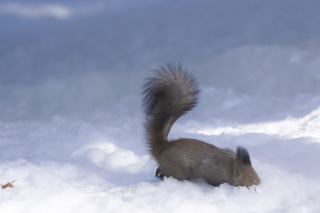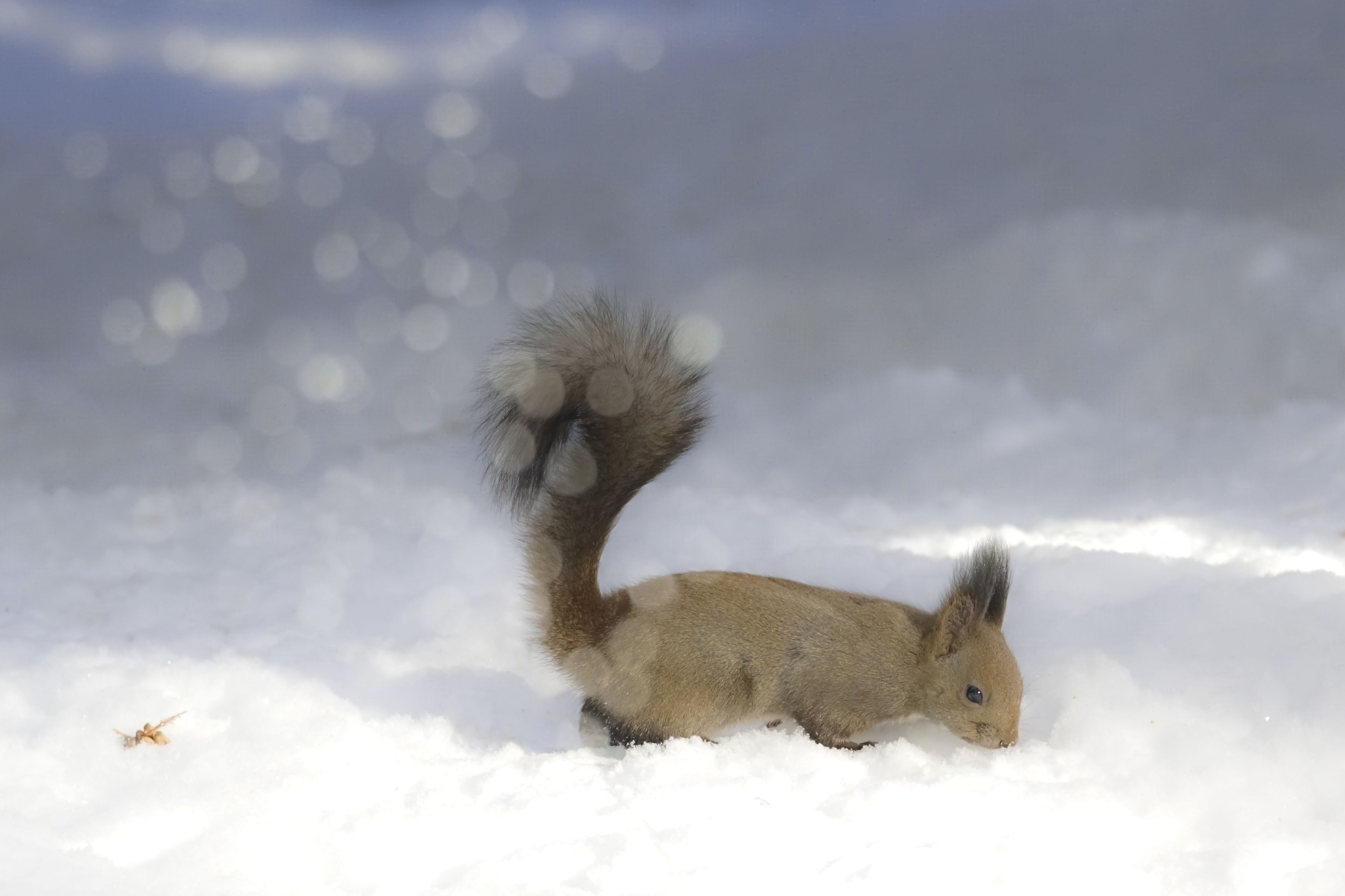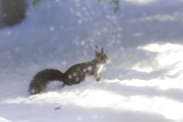地上に降りたエゾリスに粉雪が降って来ました。