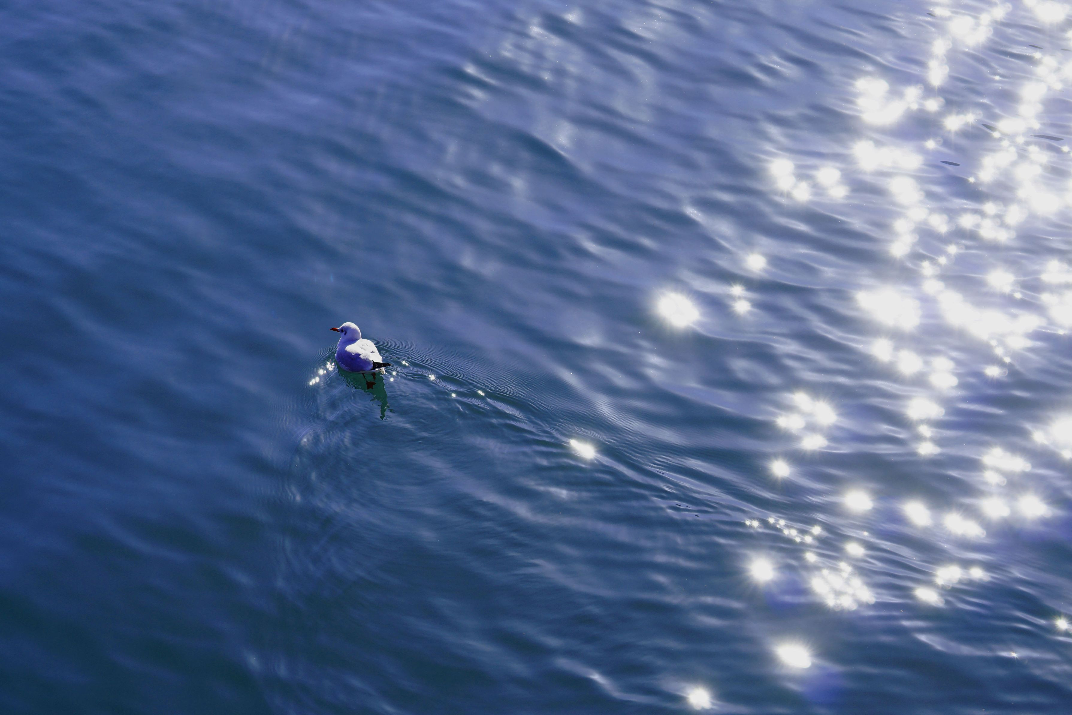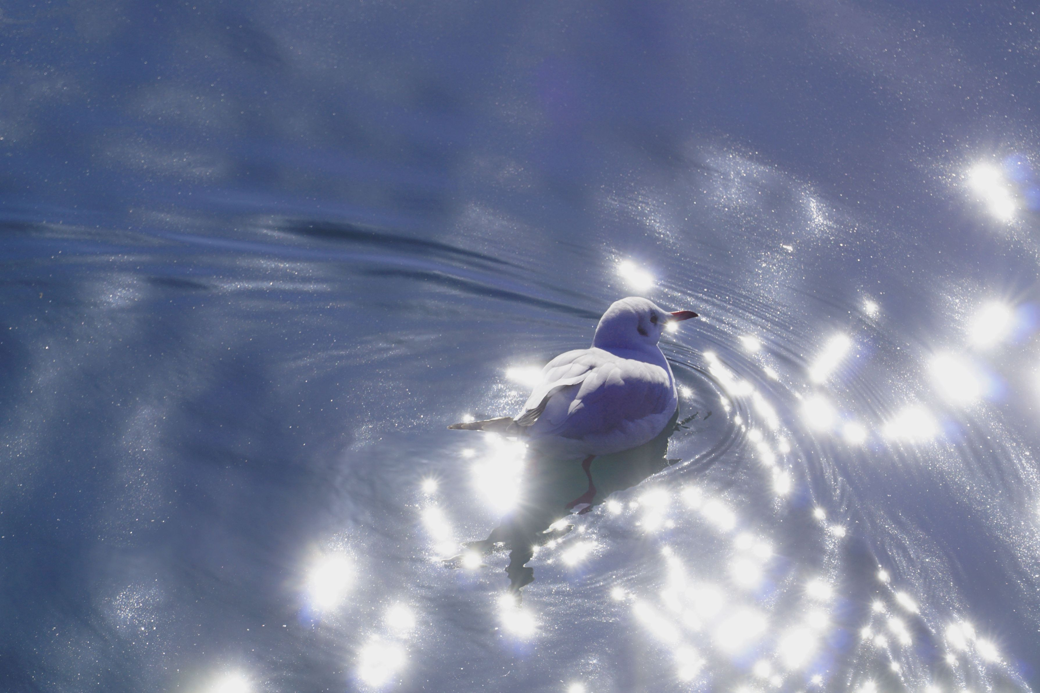 晴天の朝日の中、カモメが気持ちよさそうに泳いでいました。