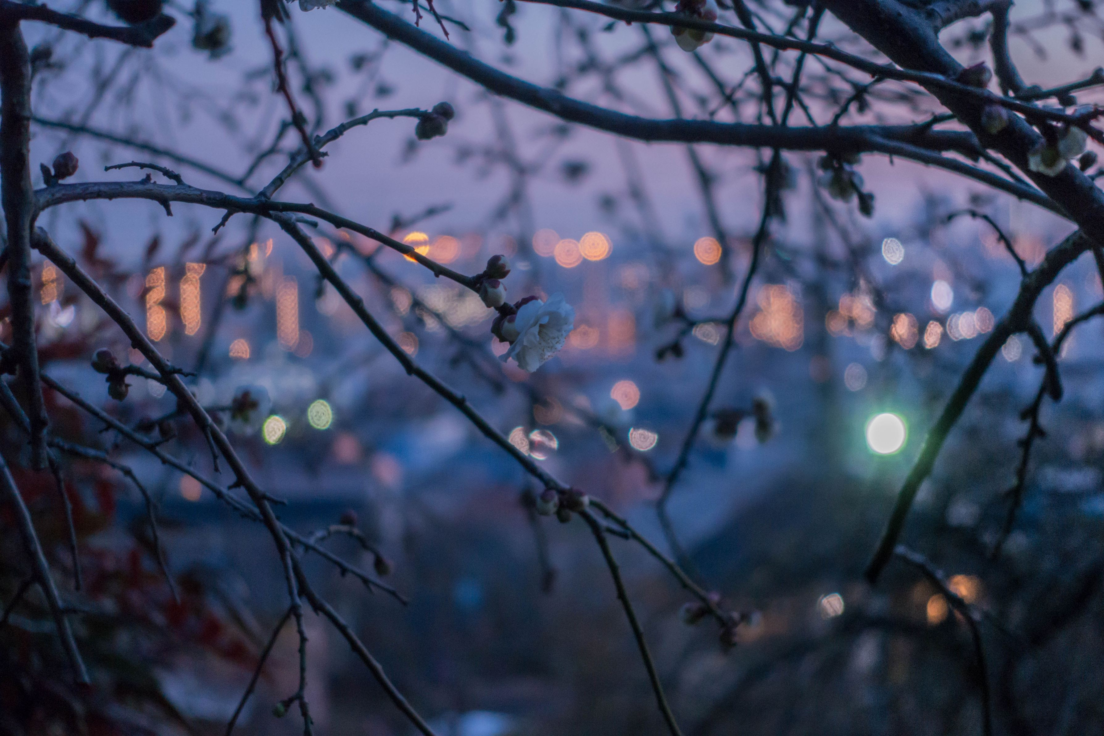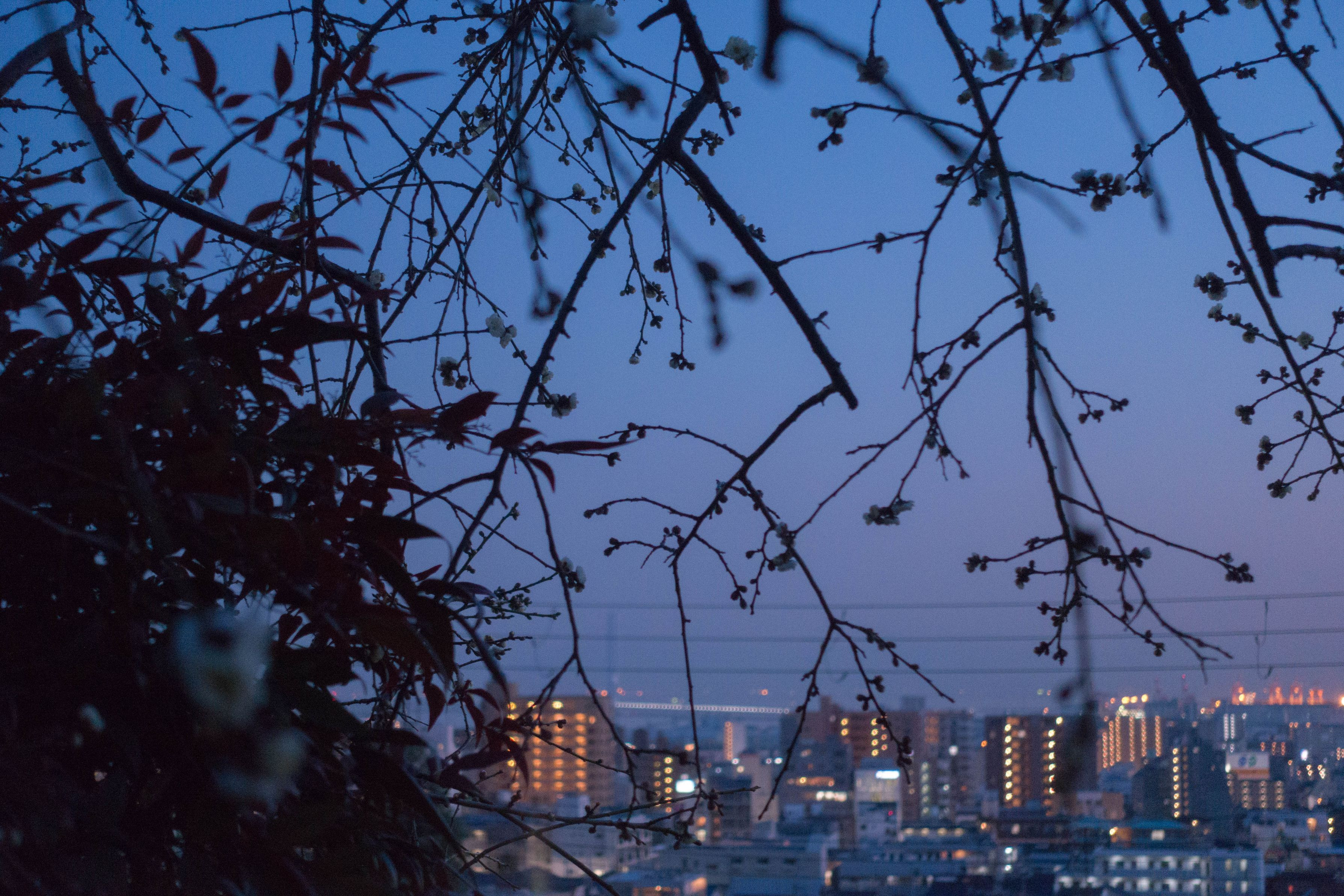 毎日寒い日が続いてますが、梅の花の蕾が膨らんでいました♪ 夜景をバックに、冬の終わりは確実に終わりを迎えていることを表現してみました。