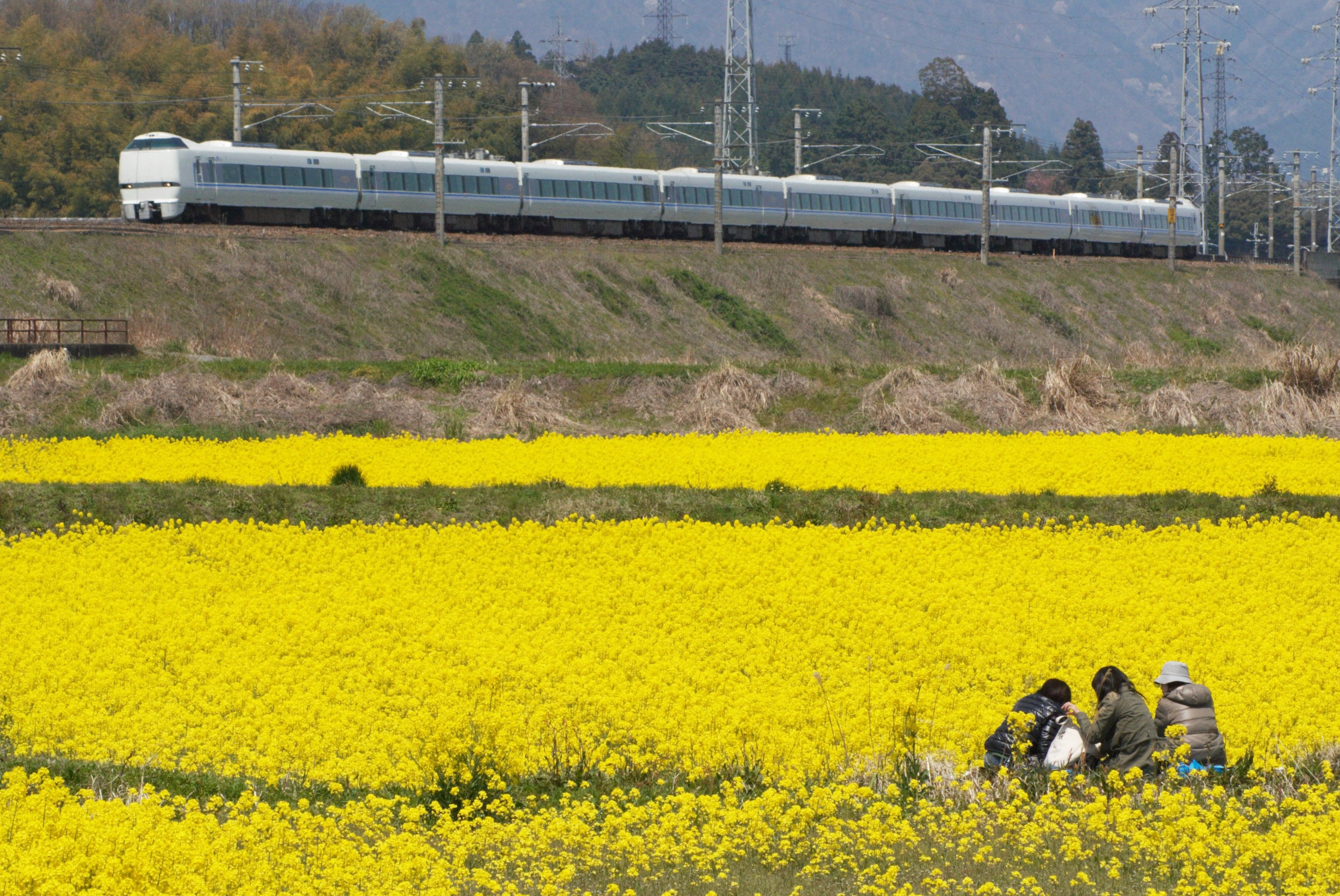 このきれいな菜の花畑を求めるのは鉄道好きも一般の方も勿論一緒。畔道で腰かけてお話中ののんびりした雰囲気を狙いました。
