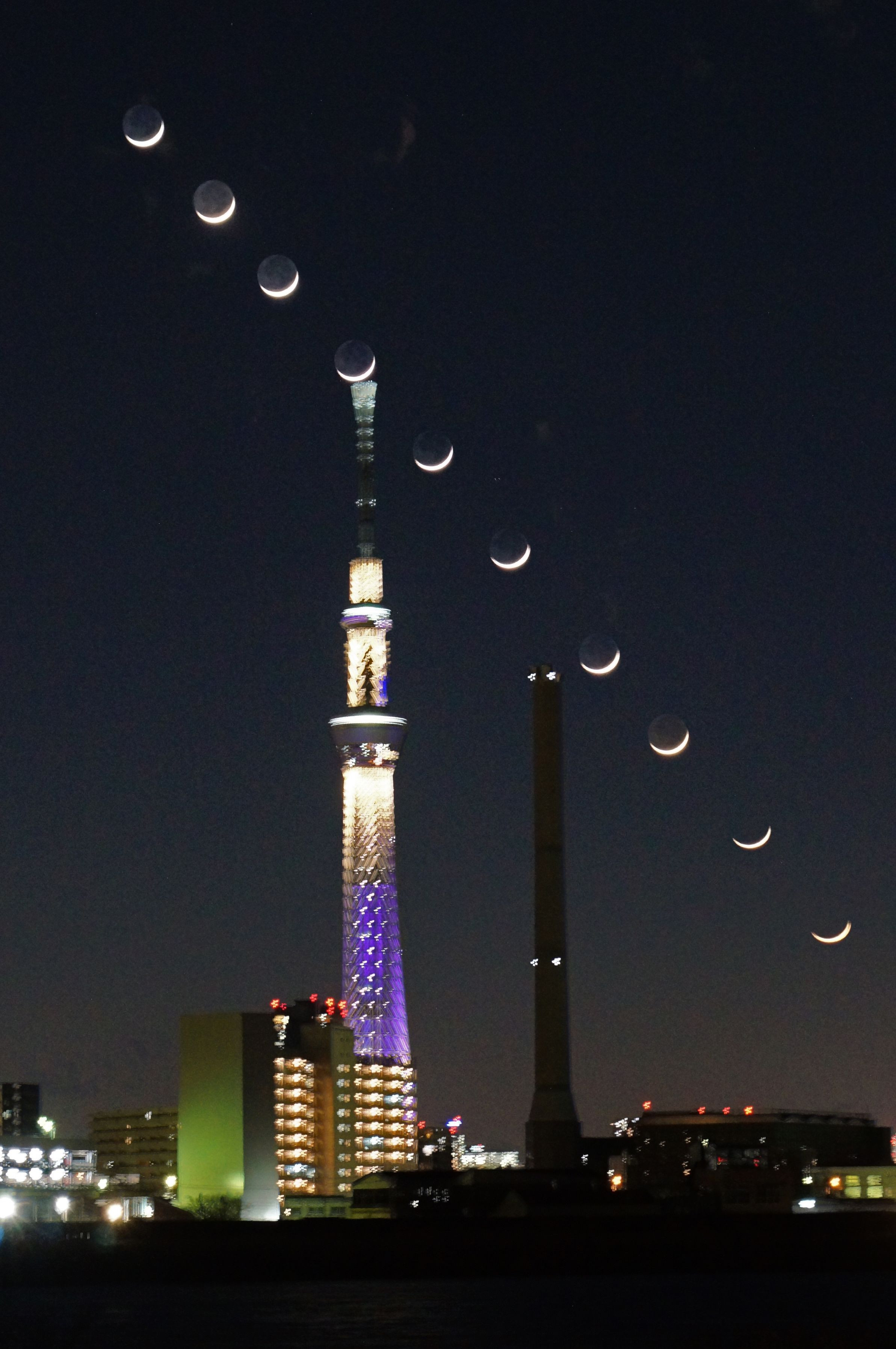 三日月がスカイツリー頂上を通過し沈んでいきく様子を比較明合成しました。
