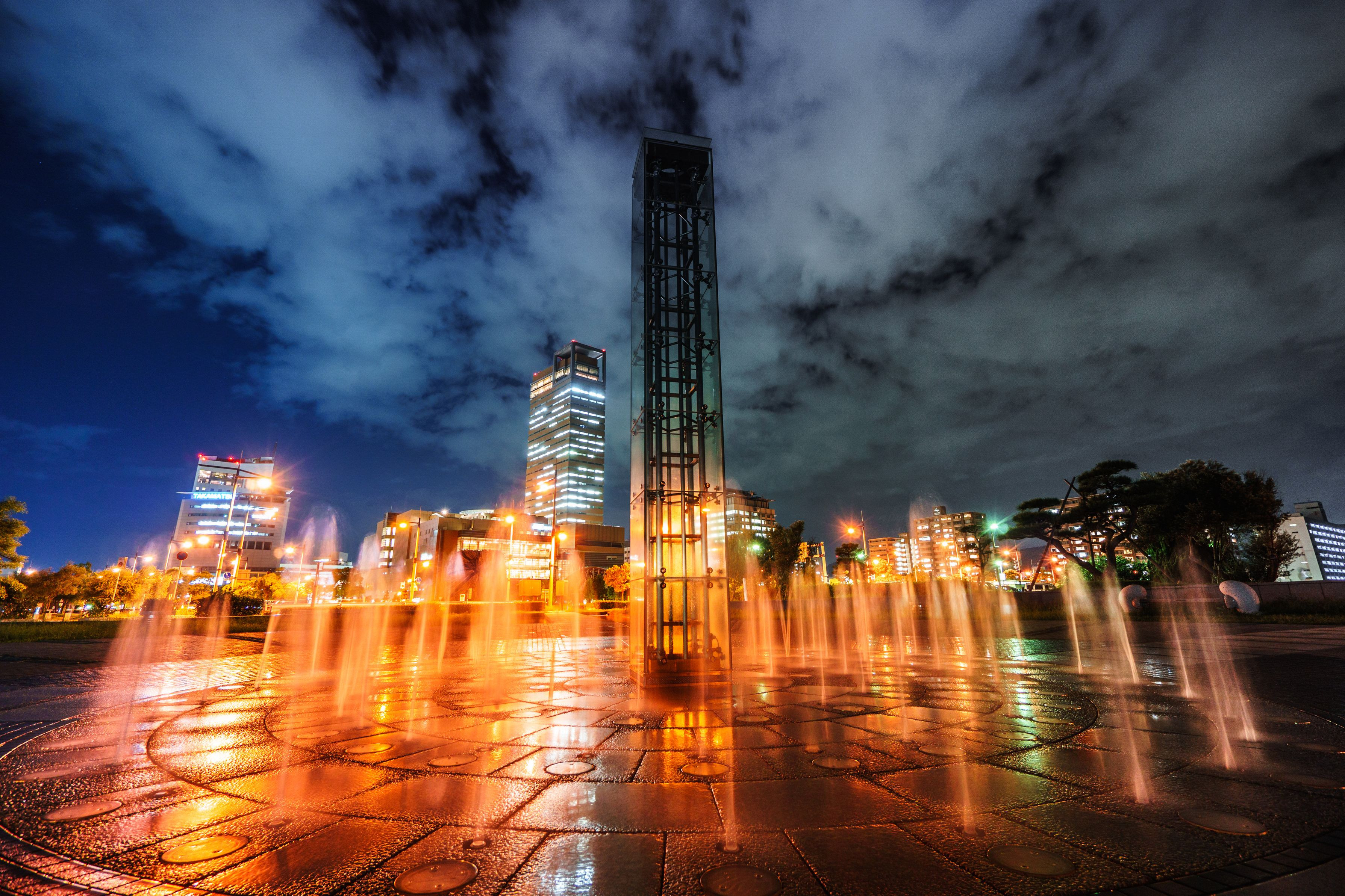サンポート高松夜景。 噴水は今の時期は昼間しかないようです。