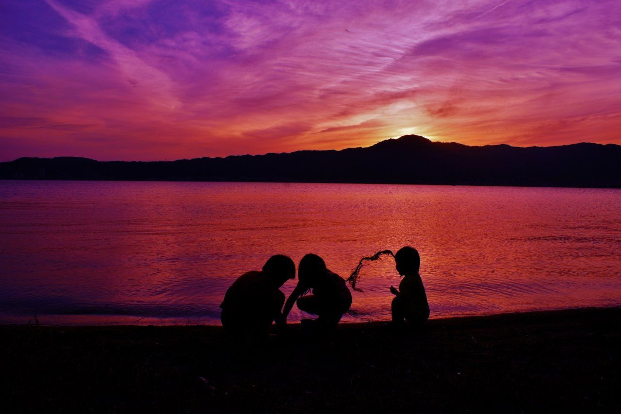 湖畔で砂遊びするチビっこ達 シルエットだけ頂きました 琵琶湖が続いたので ここいらで、一旦打ちやめです。