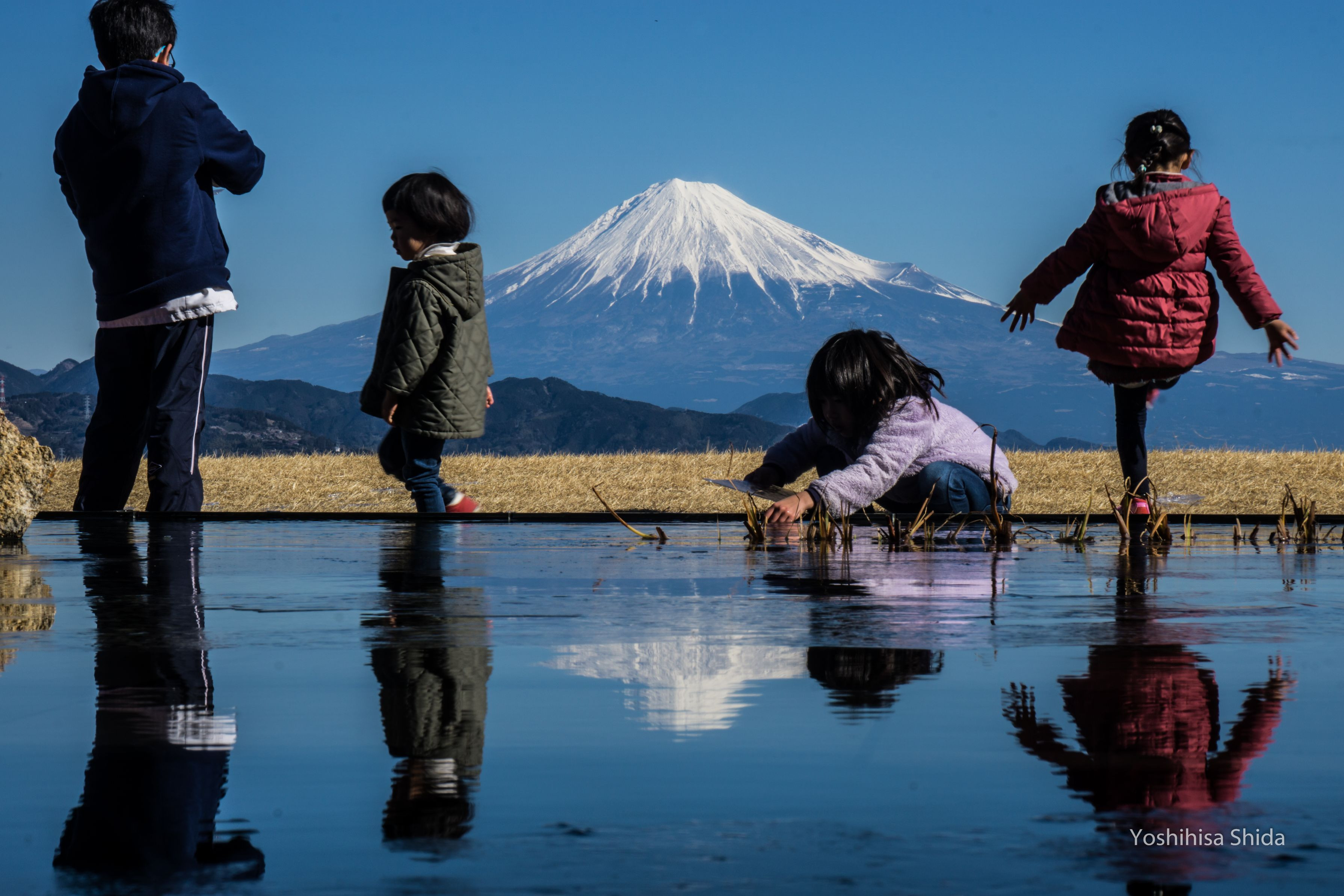 氷で遊ぶ子供たちと富士山のリフレクション