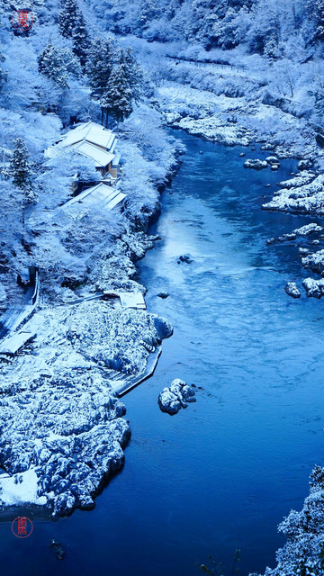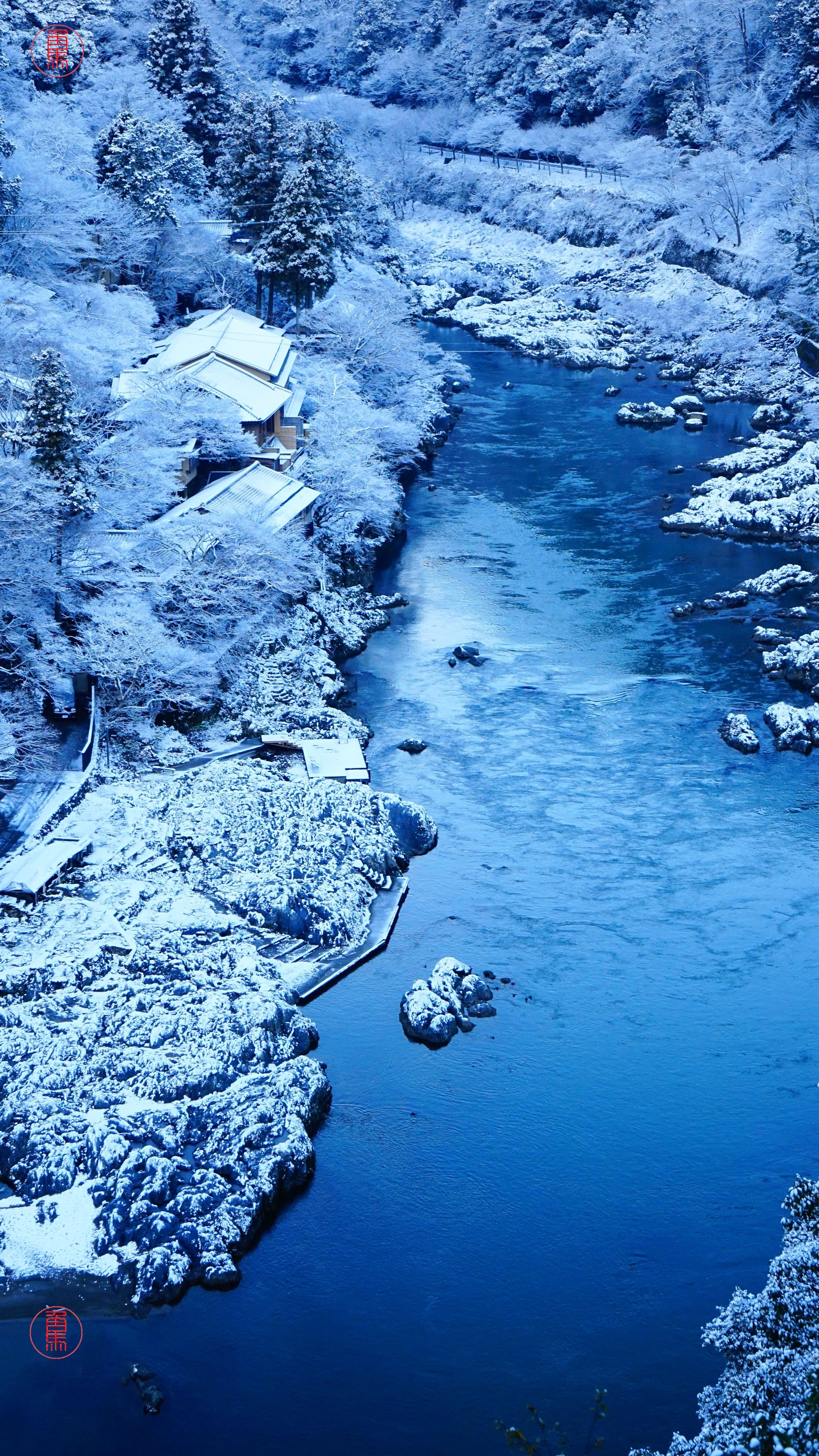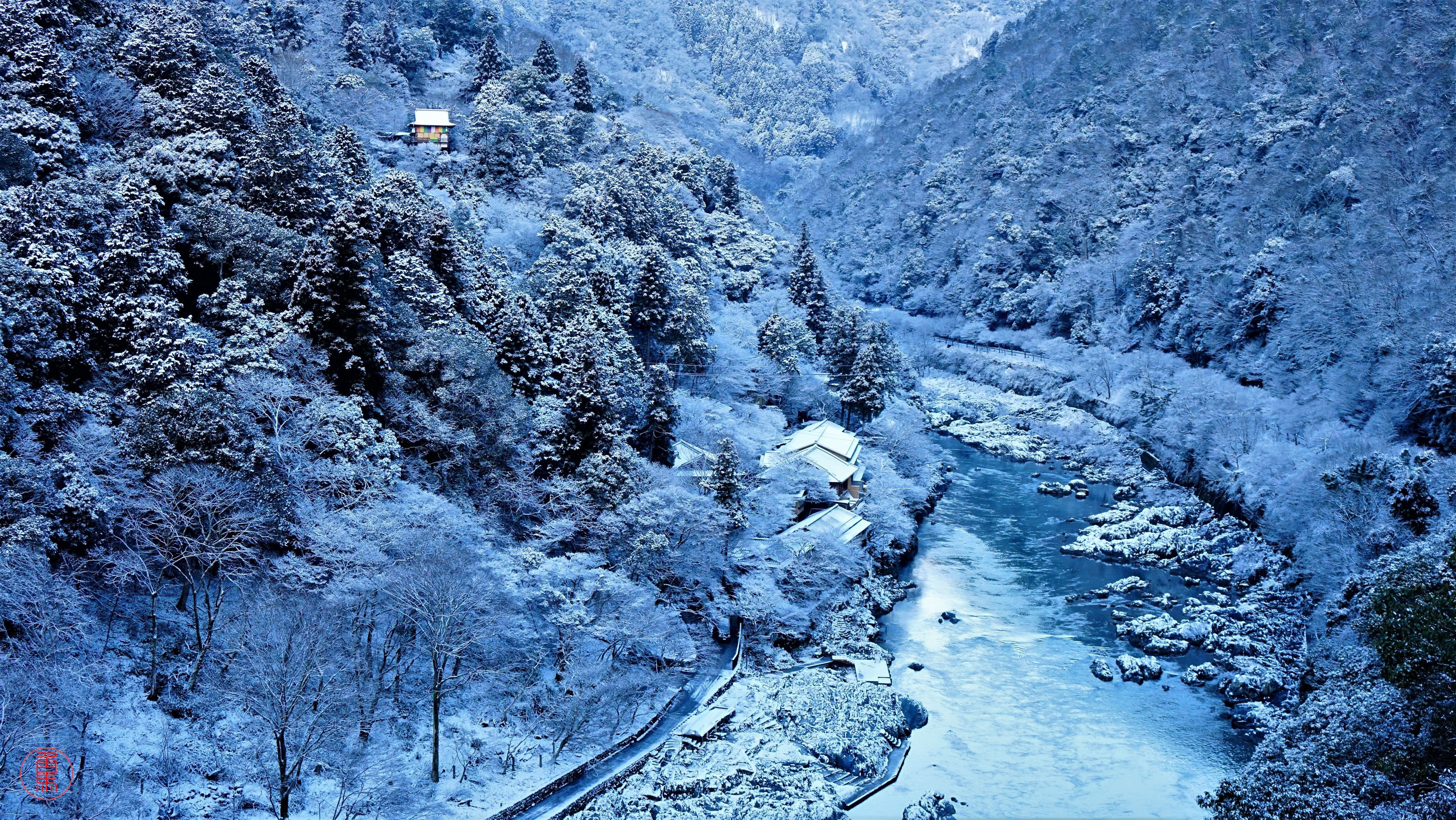 雪の朝、嵐山の急な坂を登ると 展望台に保津川の渓谷が現れます。