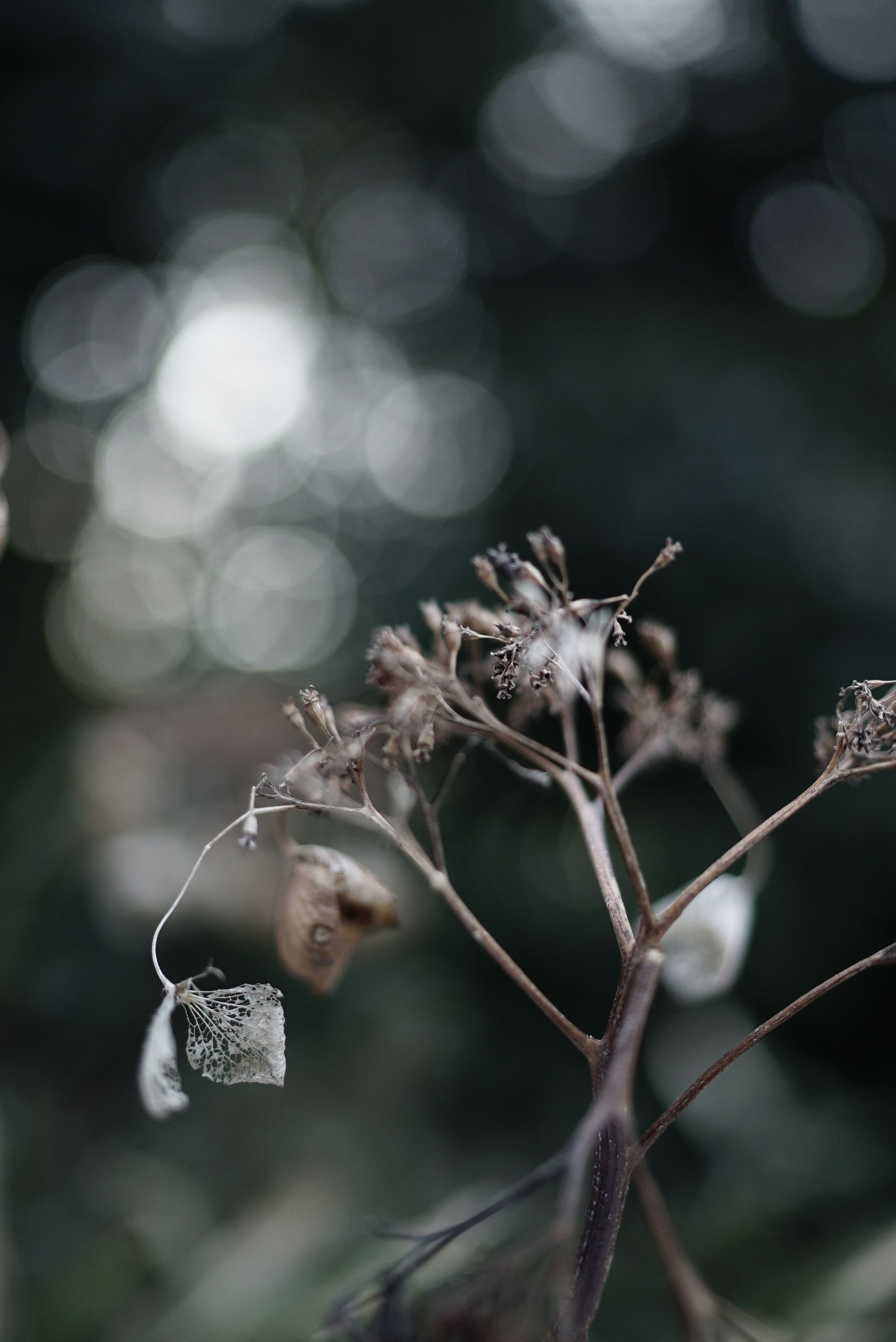 なんてことない、ただ剪定していない紫陽花が枯れたものです。が、自然に葉脈だけになったものは、他ではお目にかかったことがありません。 先日の「井川拓也先生の写真セミナー ~写真学級会~」に持って行ったのが1枚目です。帰って今日、みなさまに助言していただいたことを思いながら撮ってみました。時間が遅かったからでしょうか、玉ボケはもう、前回のようには撮れませんでした。