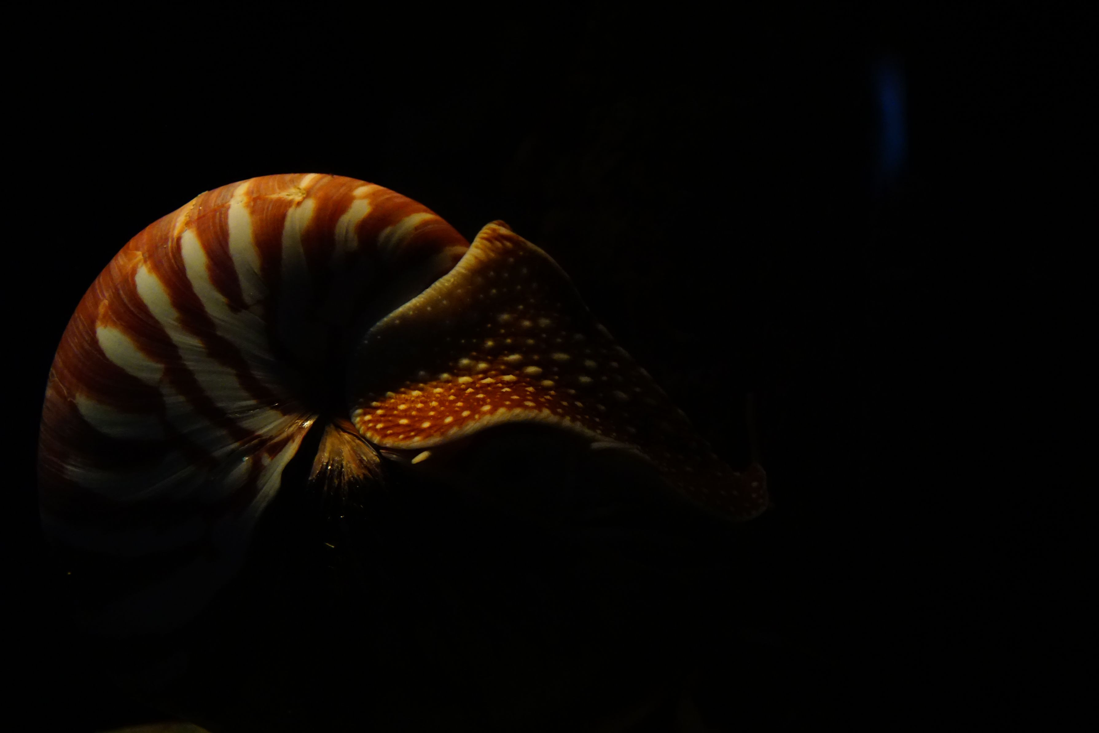 水族館での撮影はかなり難しかったです。 ほとんどボツで、動かなかったオウムガイは撮れました、が、 iso3200なのでちょっと油絵のようです。 右上のガラスの反射が残念です