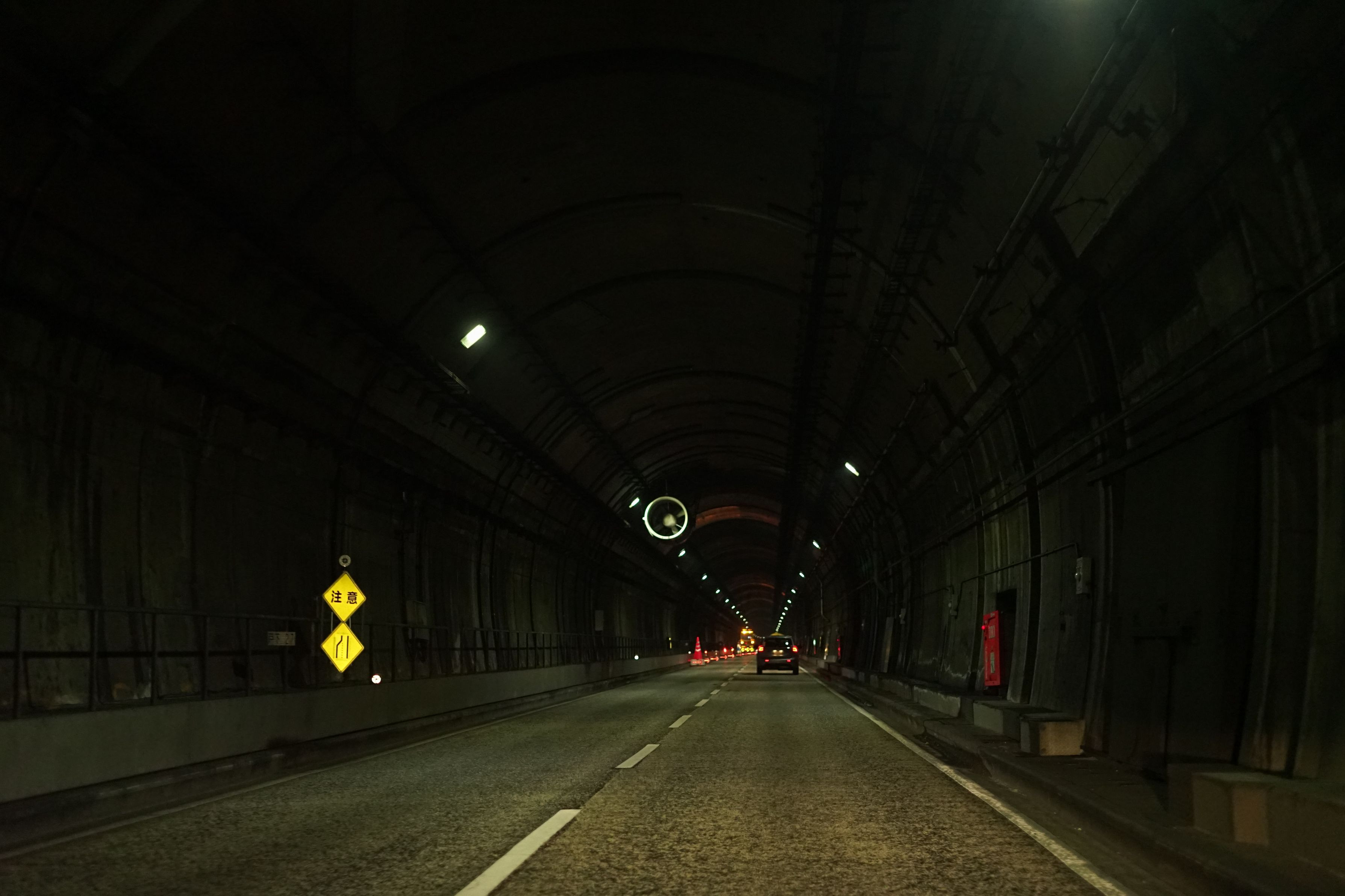 新神戸駅付近から六甲山を貫く道路トンネルです。上下線が分断されており、終始独特な雰囲気が味わえます。(助手席から撮影)