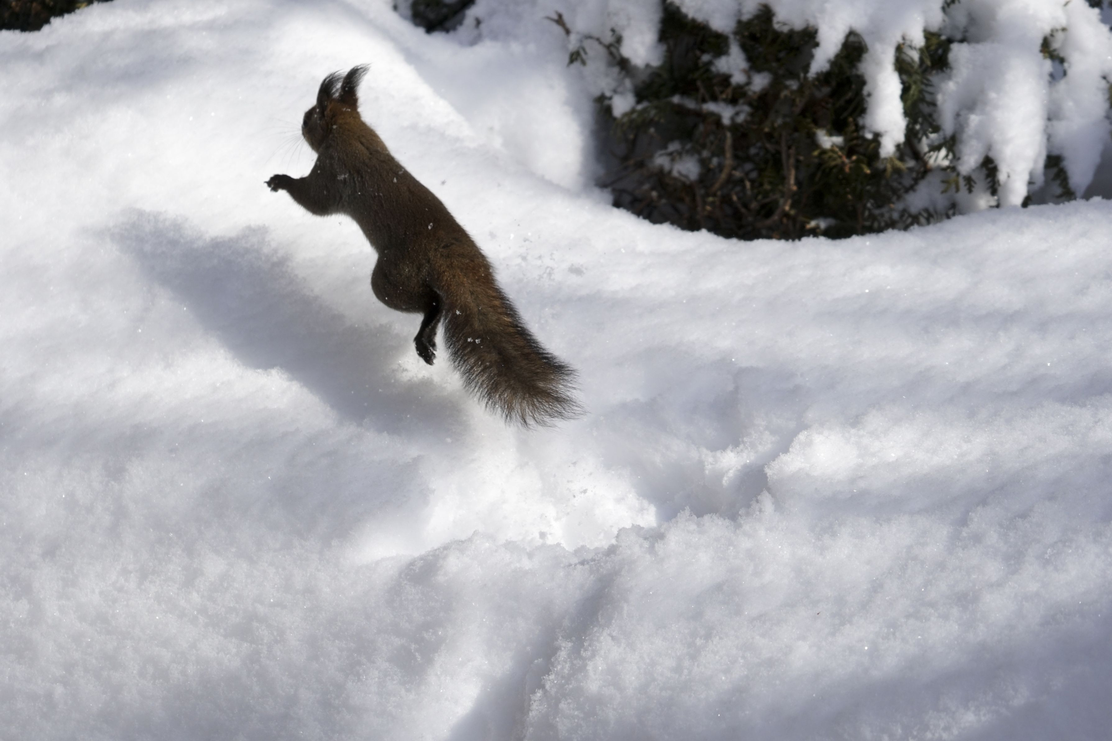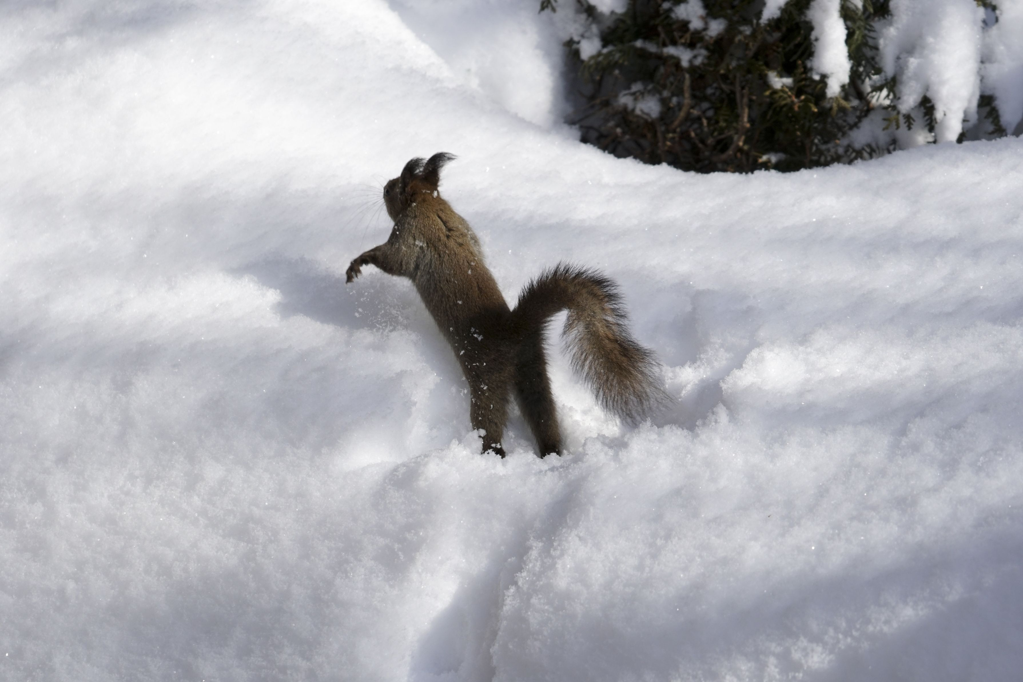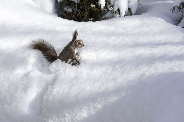 隠した木の実を探して雪まみれになったリスくん。