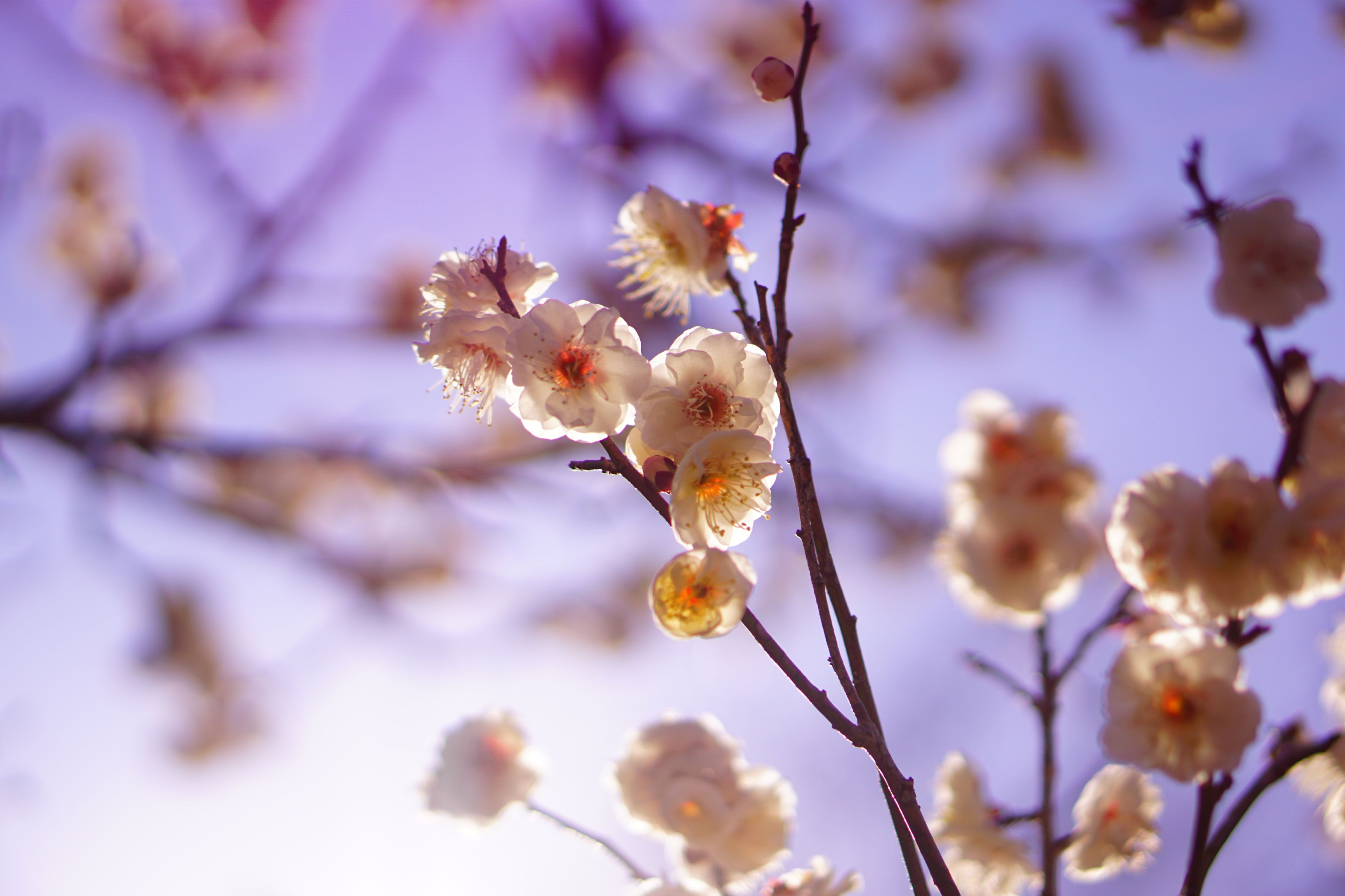 梅の花って、写真にするの難しいですね。 桜ほど花が密集していないからでしょうか。 朝の青っぽい空を背景に、逆光で撮りました。