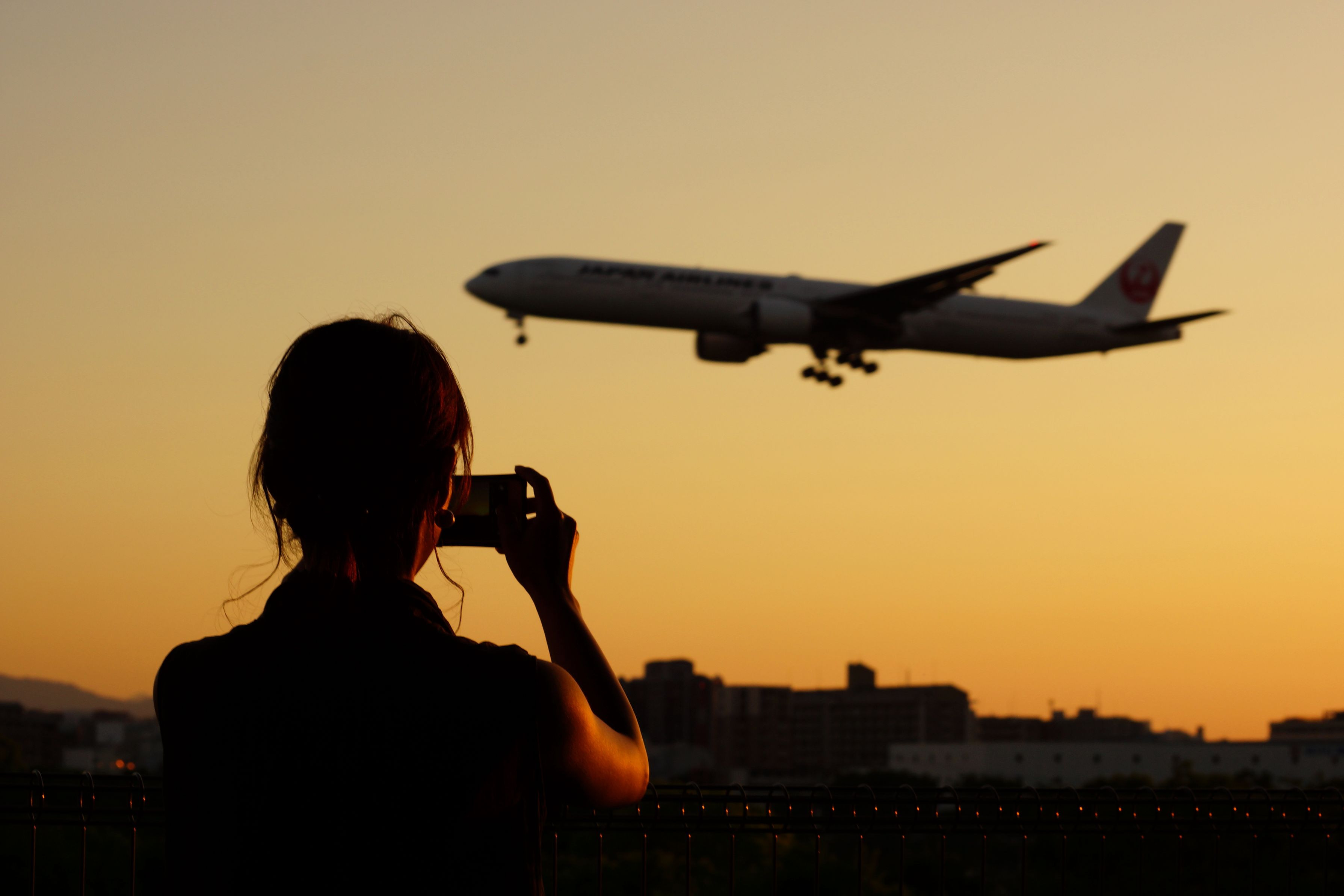 福岡空港近くのホームセンターの駐車場は、夕焼け飛行機スポット。 お友達を連れてきたら、素敵な景色に感動してました。 そんな彼女の夢中で撮る姿をぱちり!