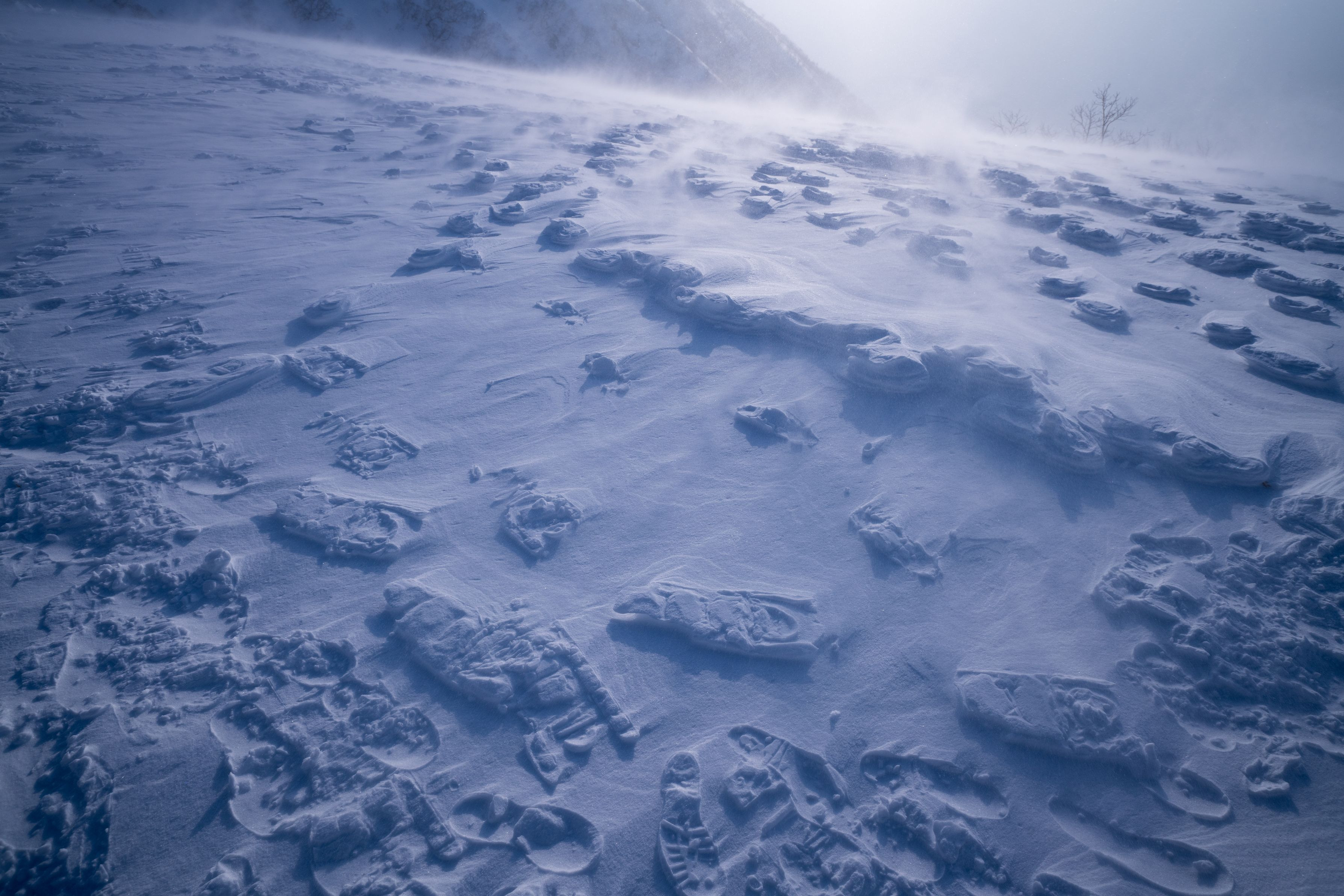 木曽駒ヶ岳に星空を撮影しに遠征。天気予報は晴天。しかし、夕方辺りから雲が出始め、夜には吹雪に。朝には雲が薄くなったものの強烈な風。地吹雪が吹き荒れる中、強烈な風に飛ばされそうになりながら撮影しました。登山者に踏みしめられた足跡以外の雪が風で飛ばされ、足跡が化石のように残っていました。舞い上がる雪がダイヤモンドダストとなり幻想的な雰囲気でした。(よく見るとダイヤモンドダストも映っています。)