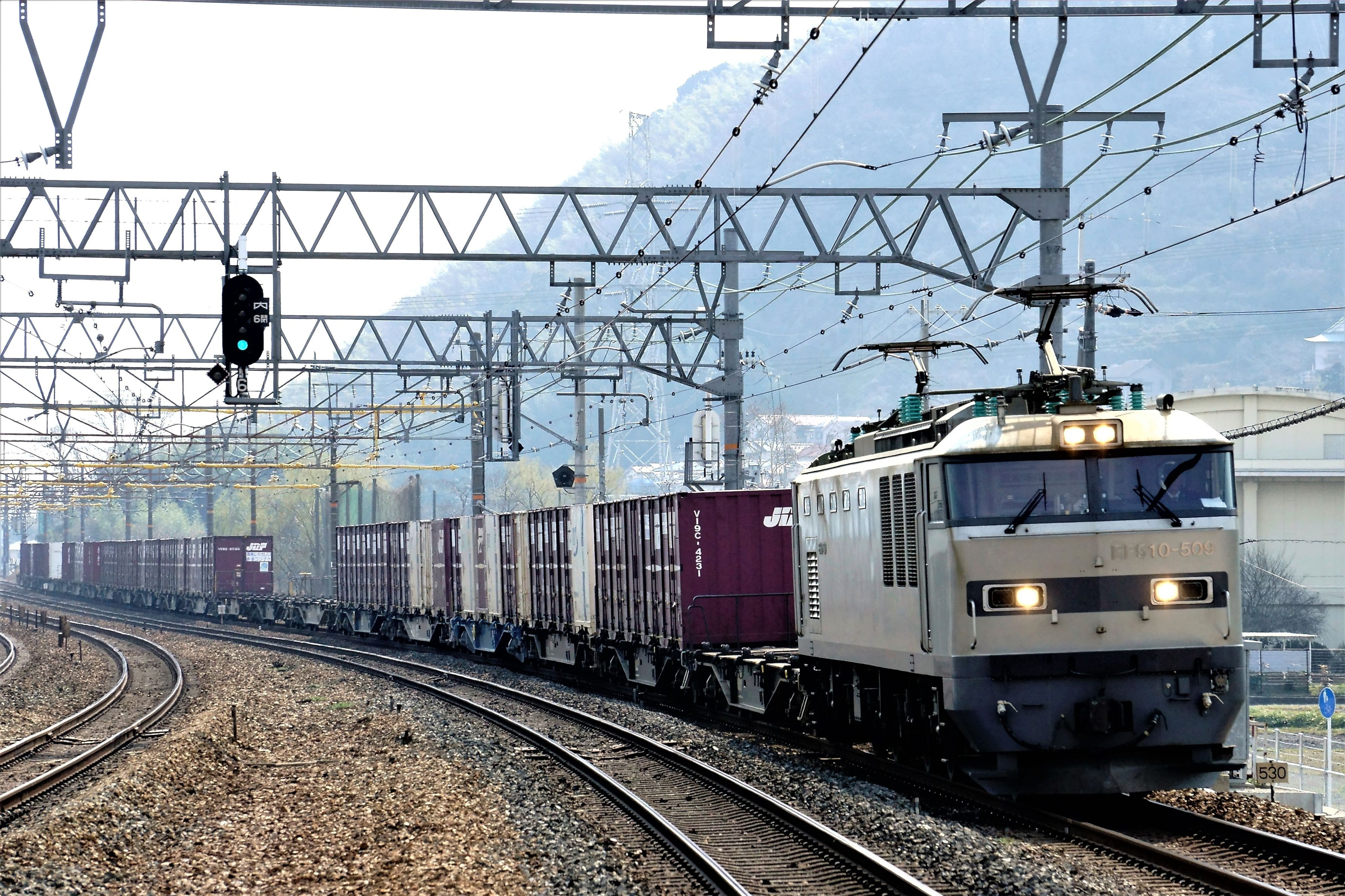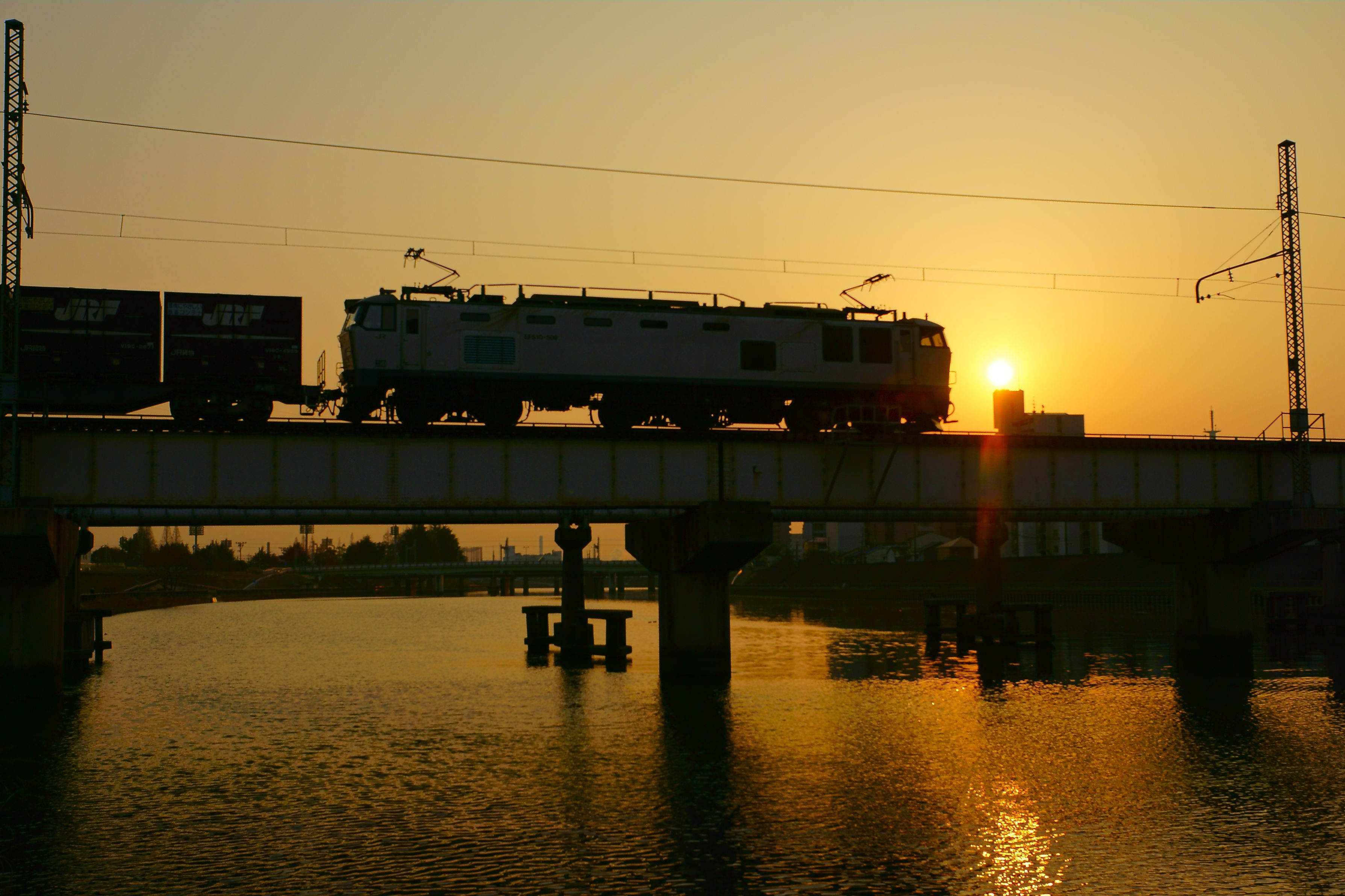ニーナの暁の単機を撮った後にやって来たEF510-509号機。 4070レ牽引の509号機が朝焼けの神崎川橋梁を行く。 14時過ぎ新潟を目指して4071レを牽引して島本を通過する銀釜。