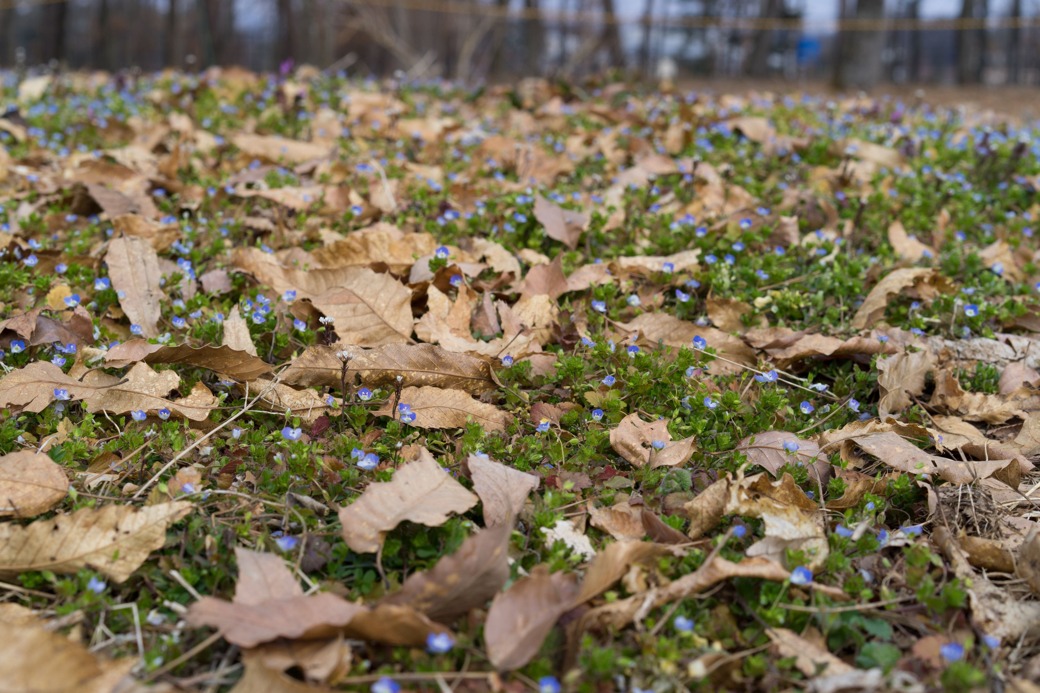 足元に目を向けてみたらオオイヌノフグリ(名前あってる?)と枯れ葉が良い感じ。