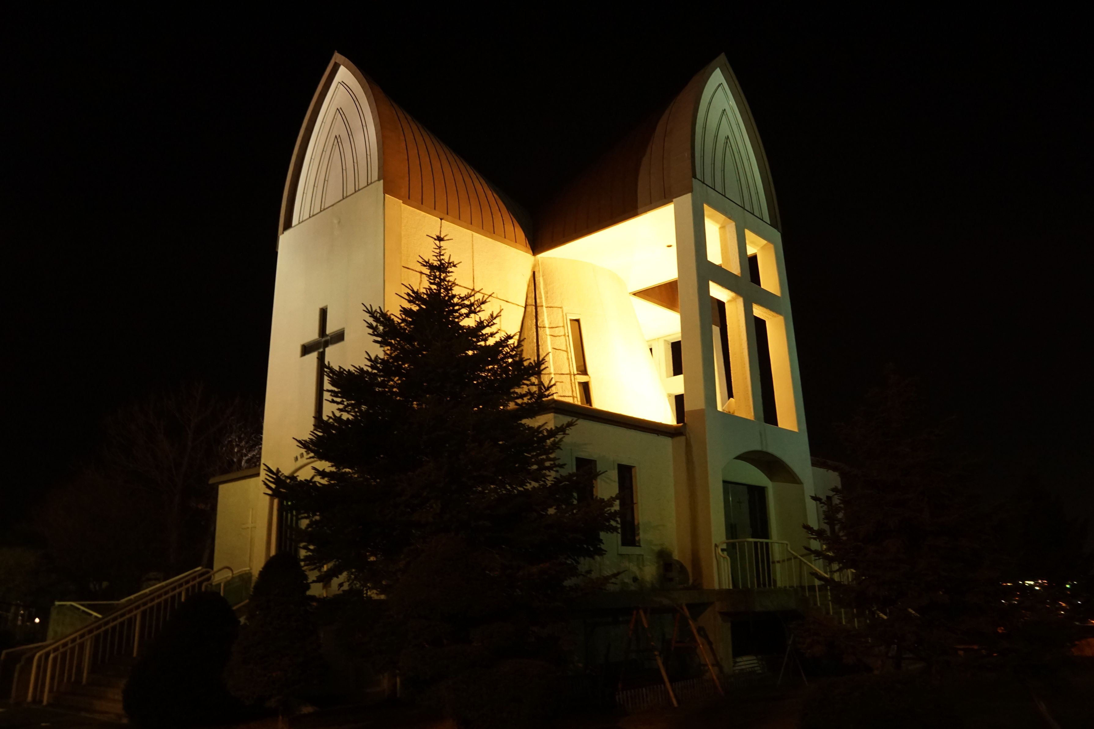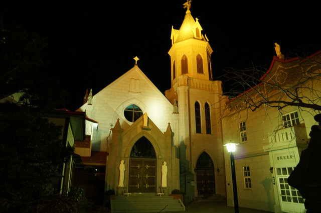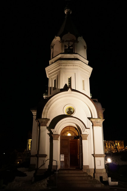 前回は函館市元町地区の昼間の教会の写真をご覧頂きましたが、今回は夜の様子です。ライトアップされると雰囲気がガラリと変わりますね。