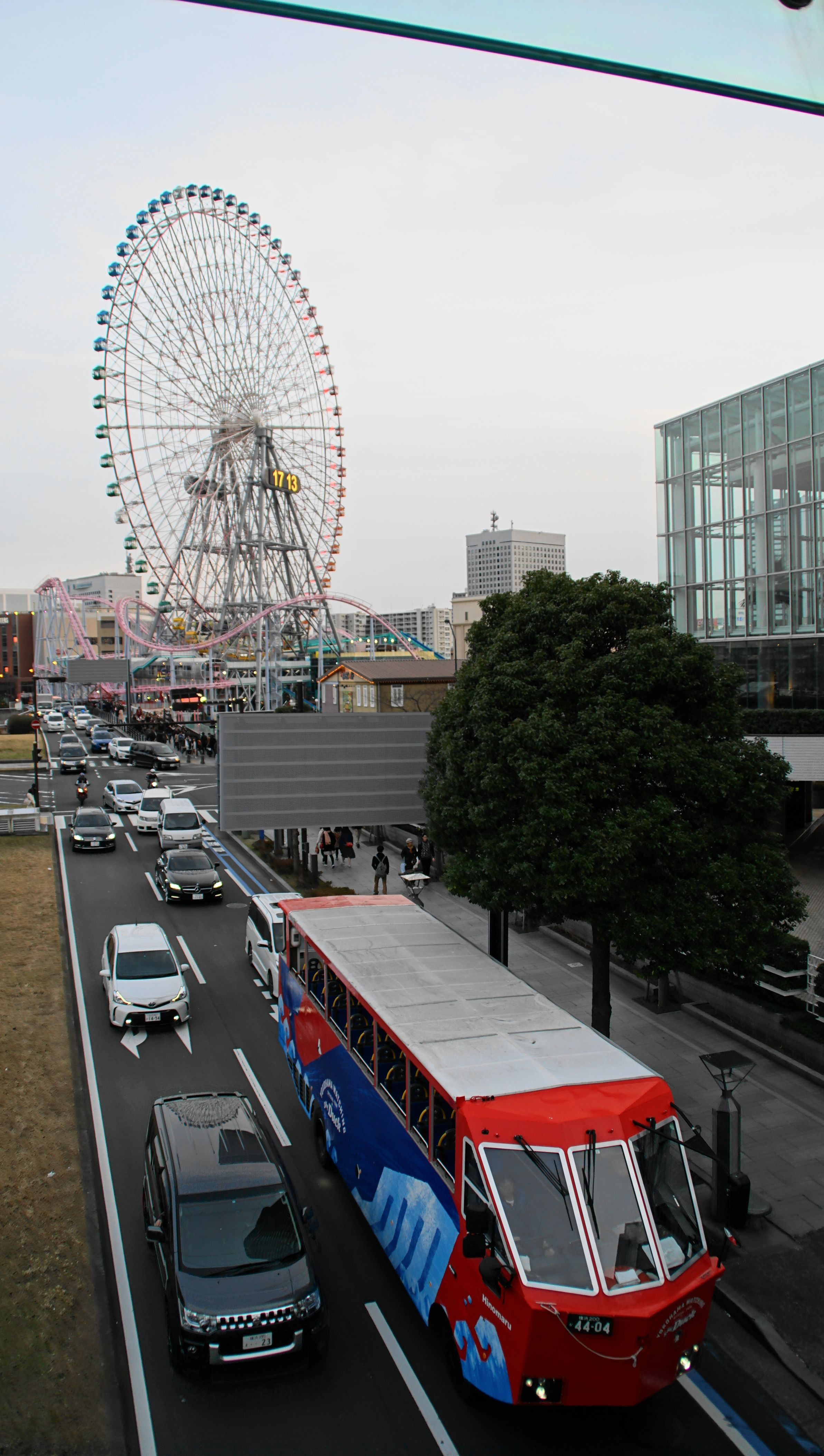 CP+の帰り道、昨年の8月から運行が始まった、横浜みなとみらい地区を陸上と海上から周遊観光する「横浜スカイダック」に遭遇、地元ながら、まだ乗っていないのですが(-_-;)