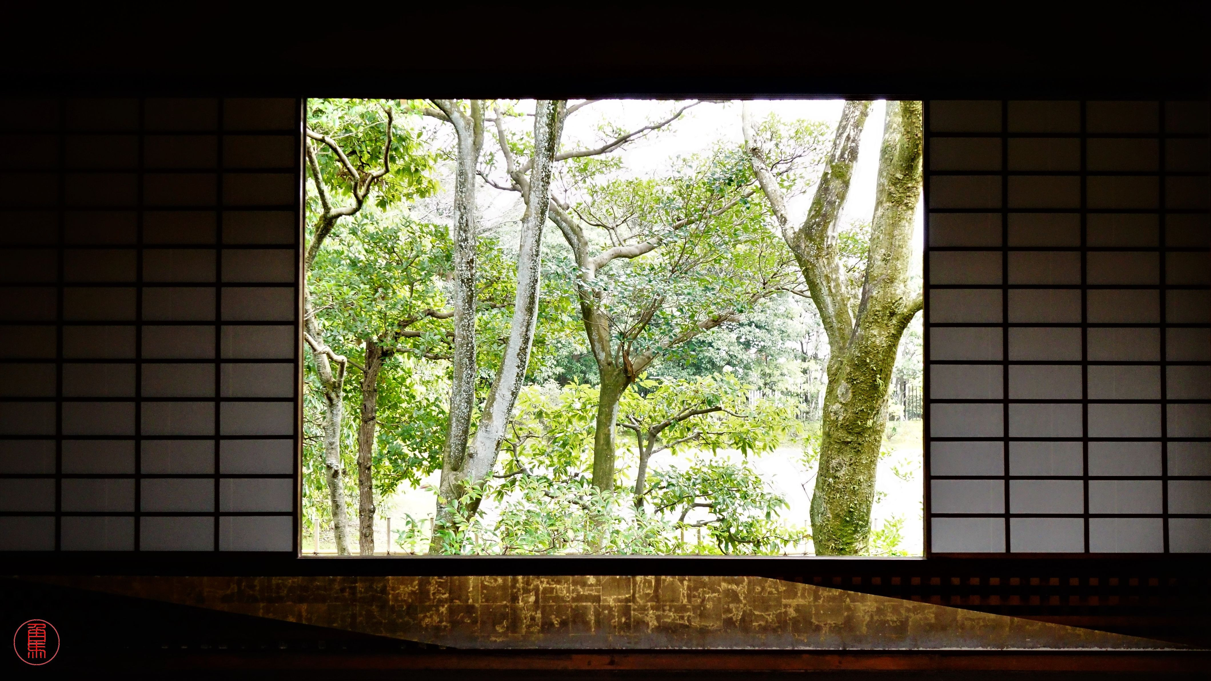 特徴の一つでもある窓下の金箔はかつて貼られていたビロードの虫食いを