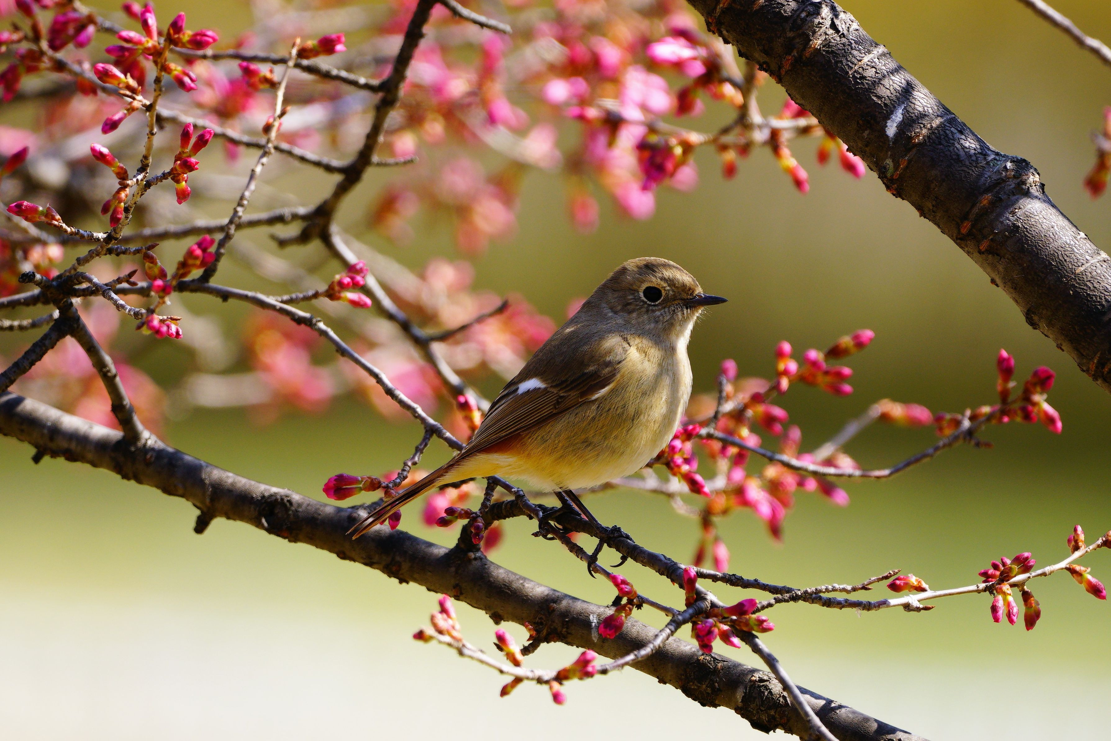 おかめ桜とジョウビタキ♀ 2分咲の頃、そろそろかな~っと行って見ると カワイイ子が飛んできてくれましたよ~♪
