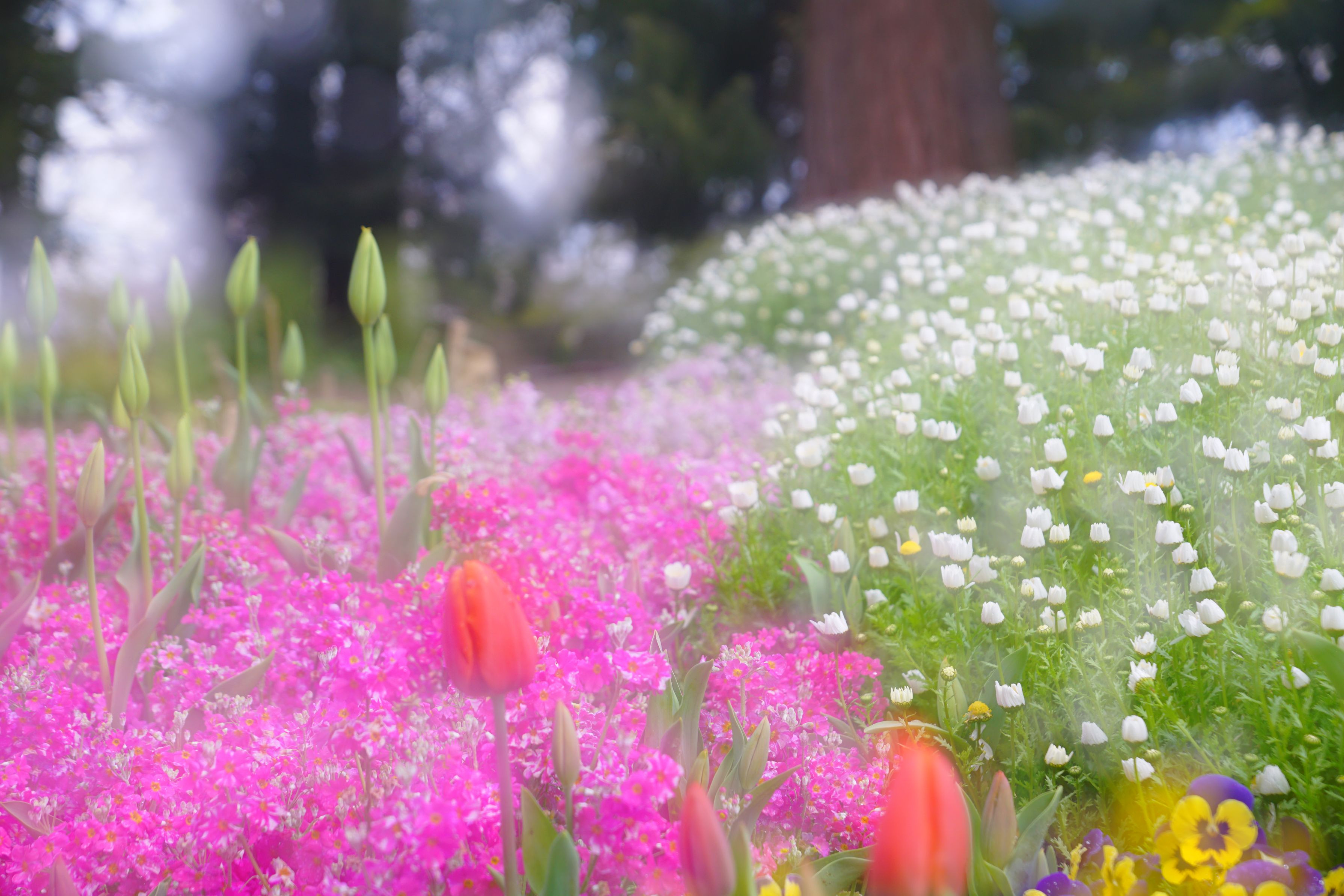 昼間のスローシャッターのピントずらしで、やわらかいボケに包みました。 わたなべももの写真講座「うららか春の花撮影会」で撮影しました。
