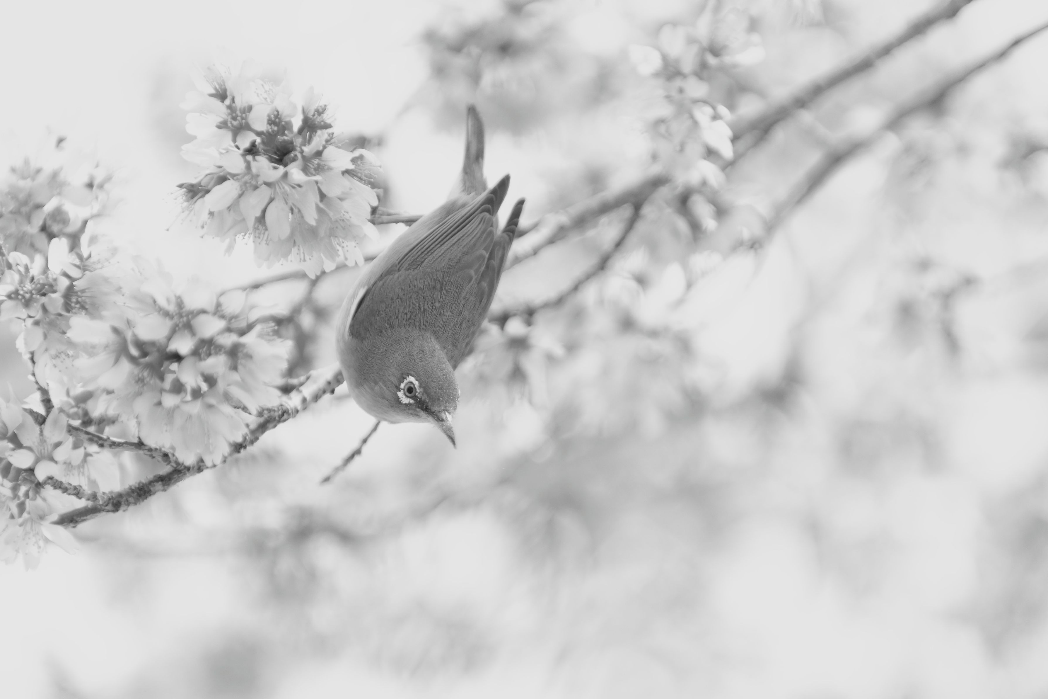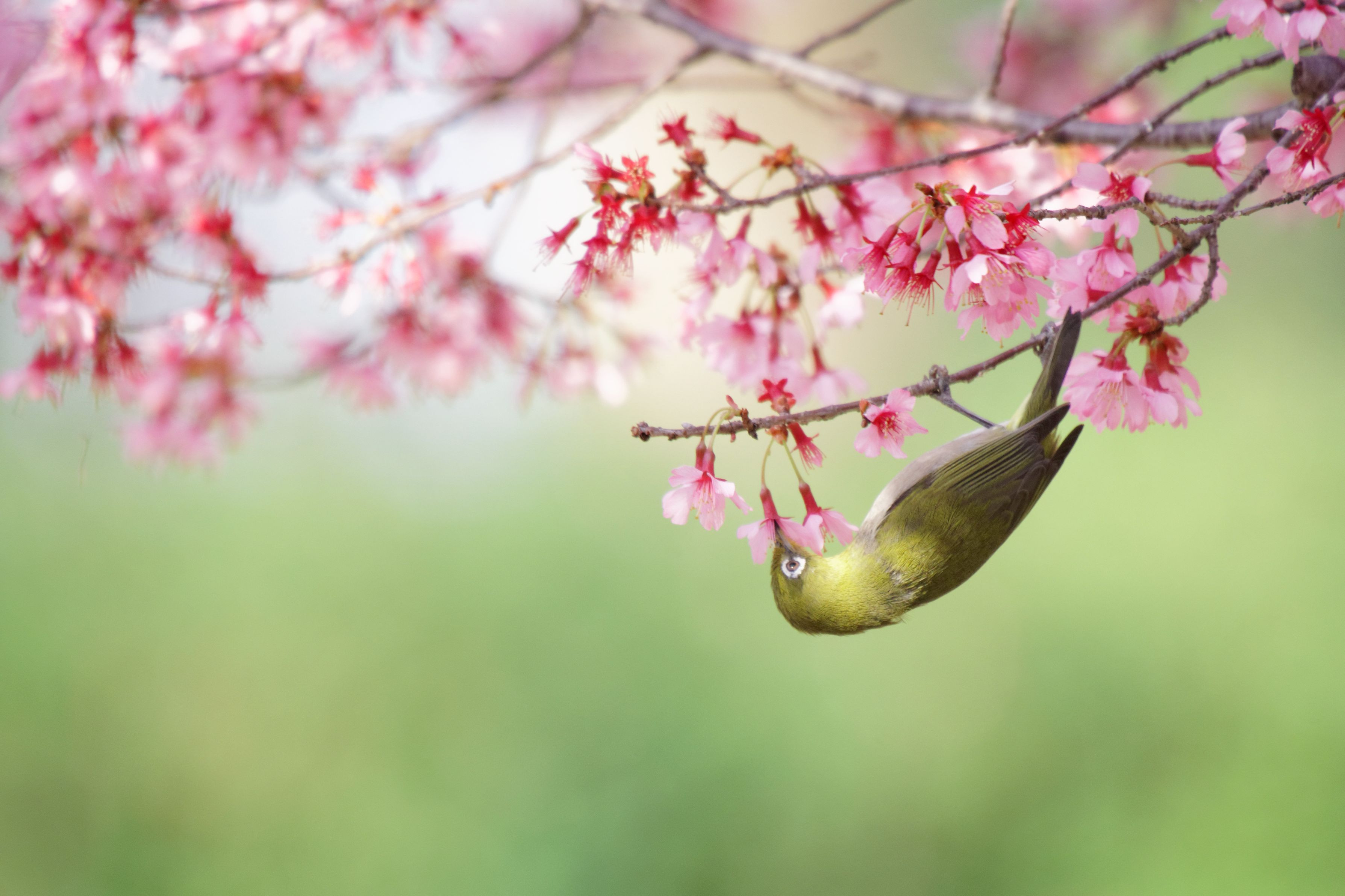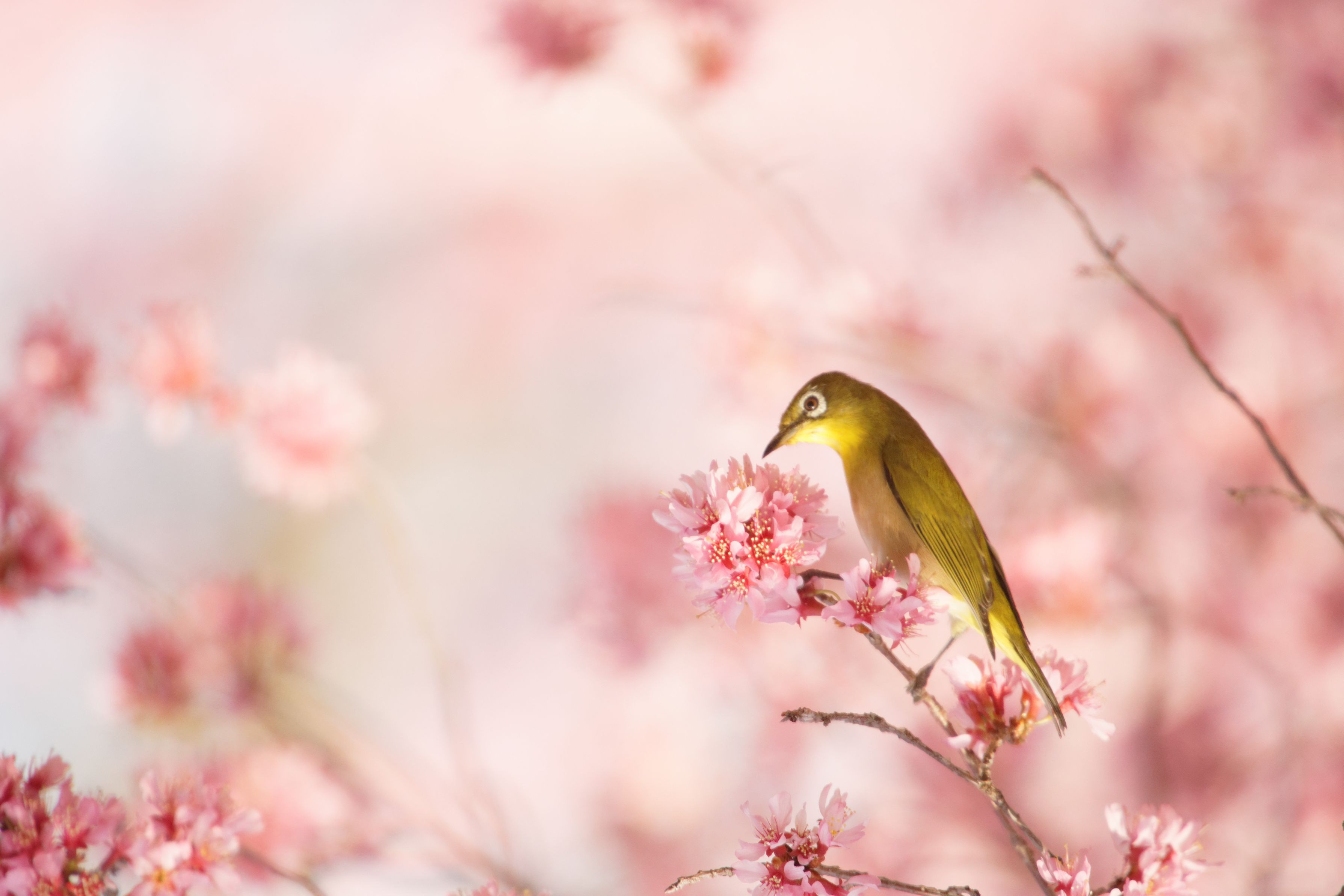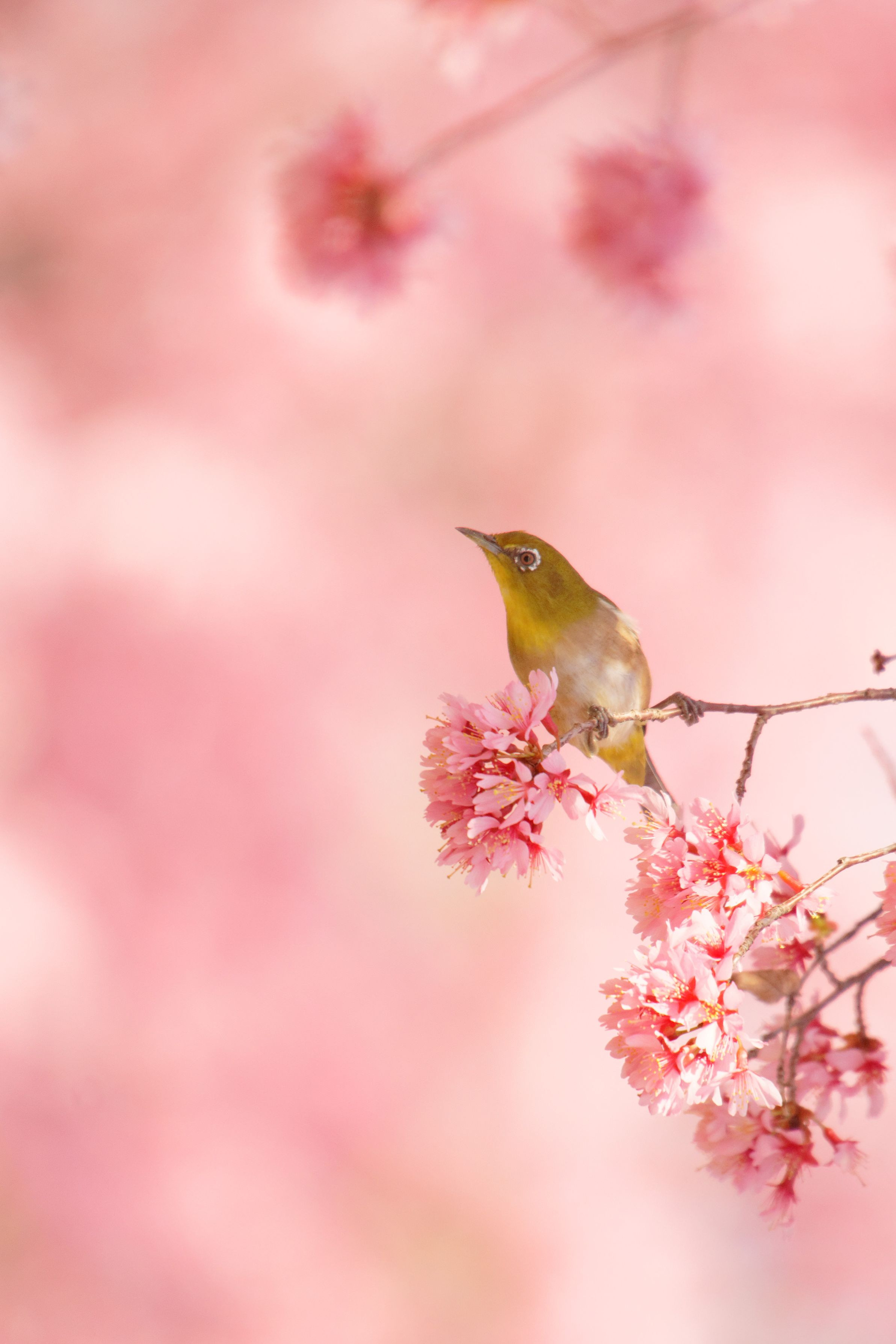 今年は満開で撮ることが出来たオカメ桜とメジロ。 minolta70-200G sigma50-500 手持ち、MF。