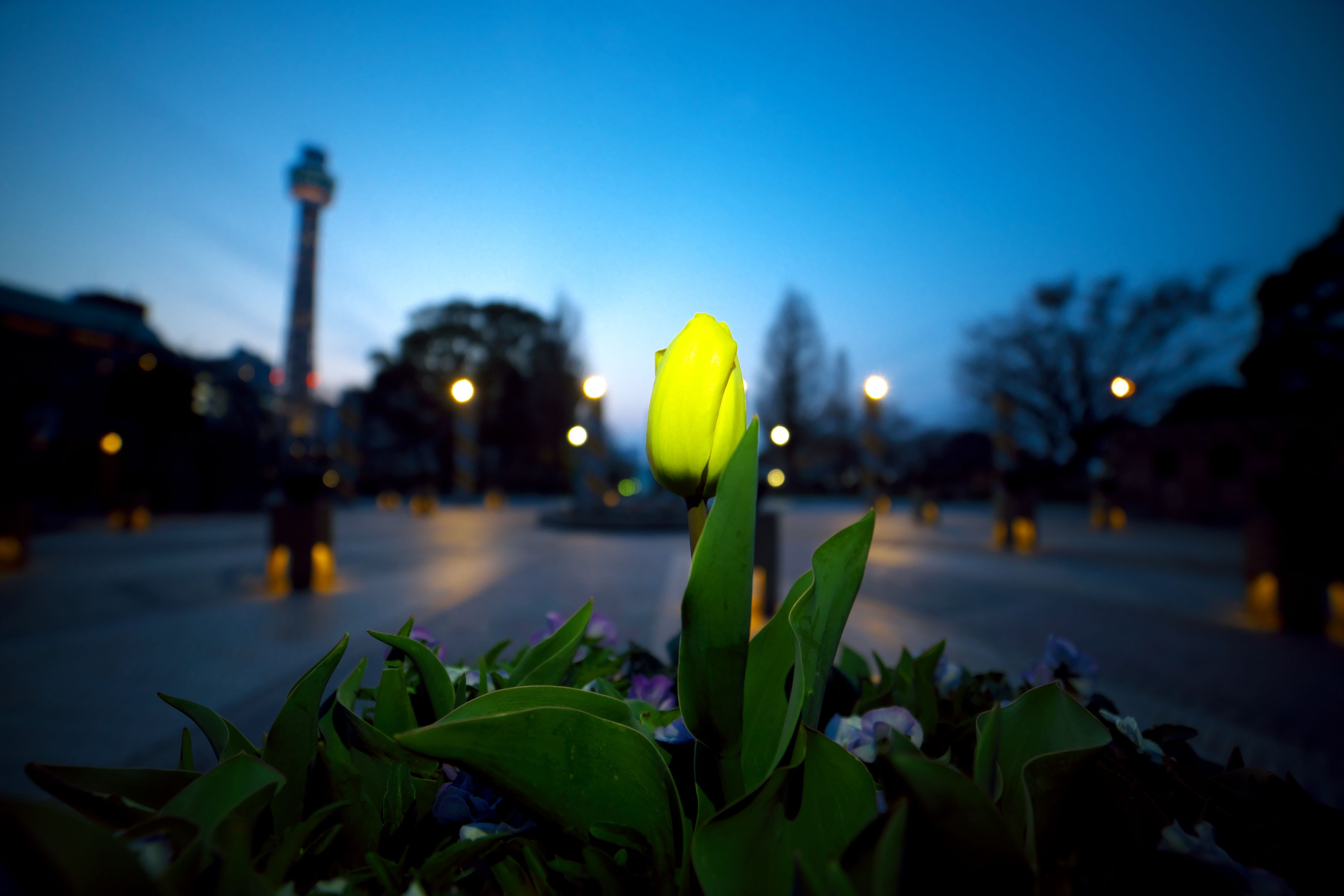 まもなく咲く黄色いチューリップ、完璧な日の丸構図です。