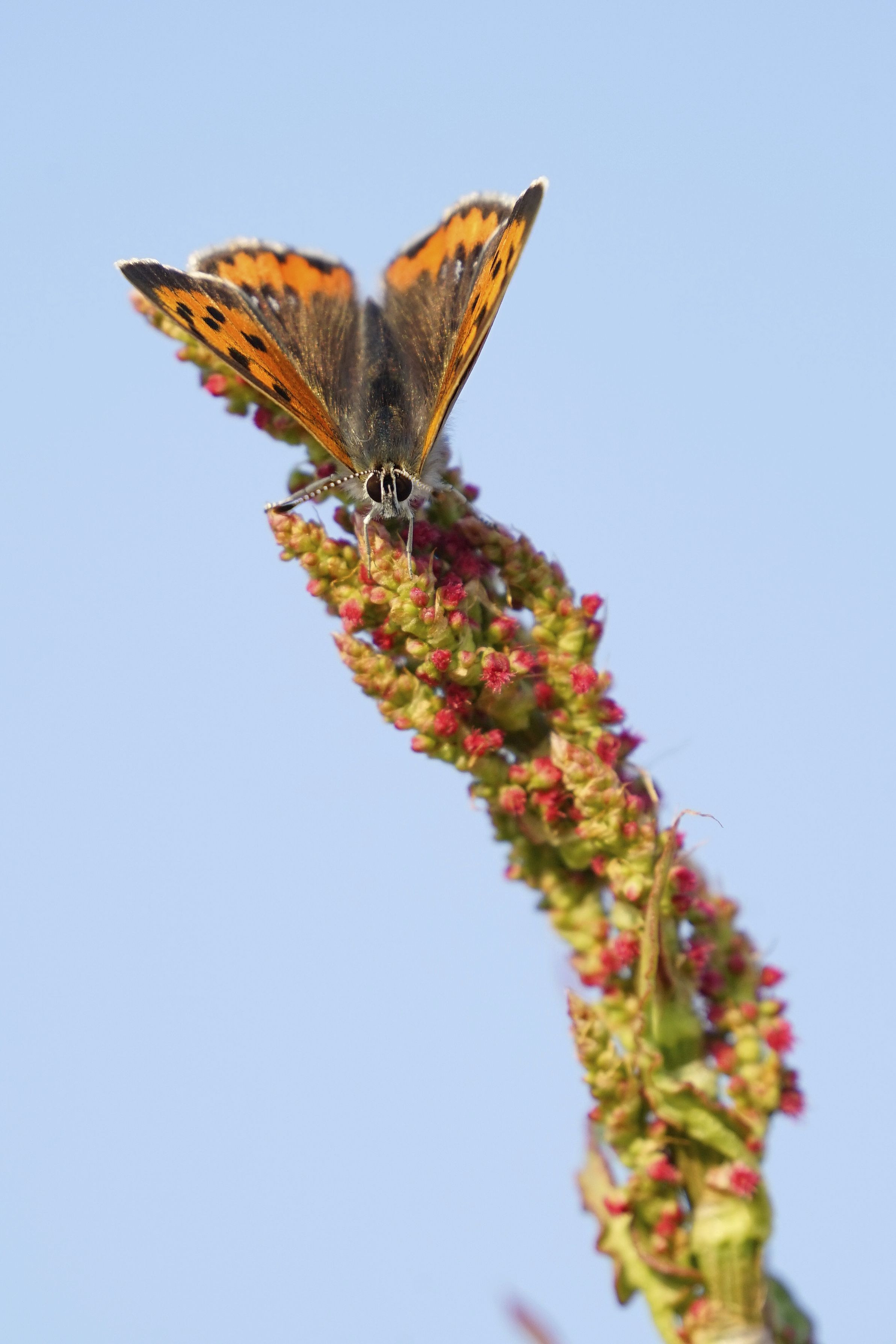 スイバの花(つぼみ)のてっぺんにベニシジミが留まって海老フライのようにに見えました。