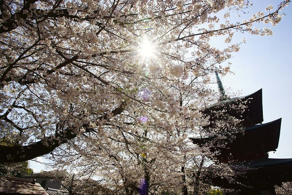 三重塔と桜。この寺では花見宴席を禁じているせいか,訪れる人は疎ら。ゆっくりと桜を堪能できた。ただ今春の桜は気難しいようだ。八分咲きで散り始めている。